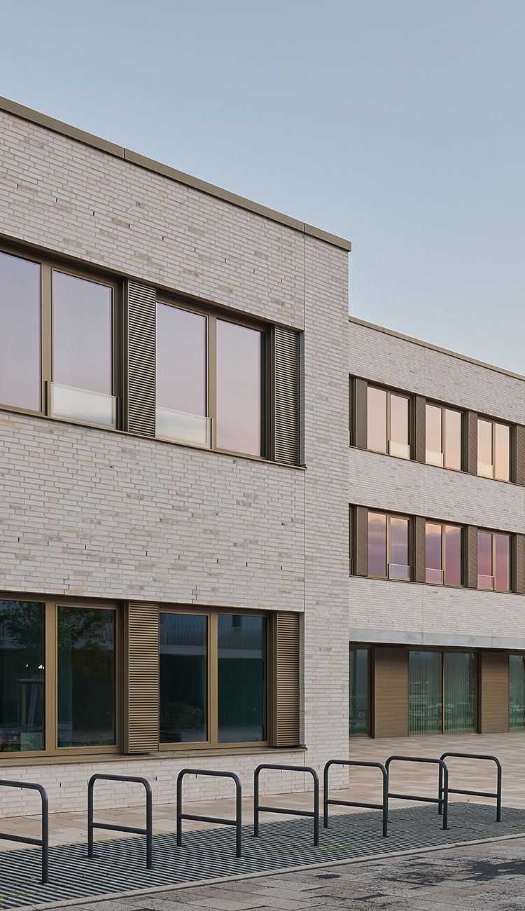Auf dem neu erschlossenen Sürther Feld in Köln-Rodenkirchen wurde im April 2022 die neue Emanuel-Schule fertiggestellt, eine inklusive, barrierefreie 5-zügige Grundschule mit Zweifeldsporthalle, die nun rund 500 Schüler:innen als offene Ganztagesschule zur Verfügung steht. Das Herz der Schule bilden die Mensa, die Aula mit Bühne und die zentrale Halle. Eine großzügige, markante Treppe führt in die Obergeschosse. Lichthöfe bringen viel Tageslicht in das Gebäude.