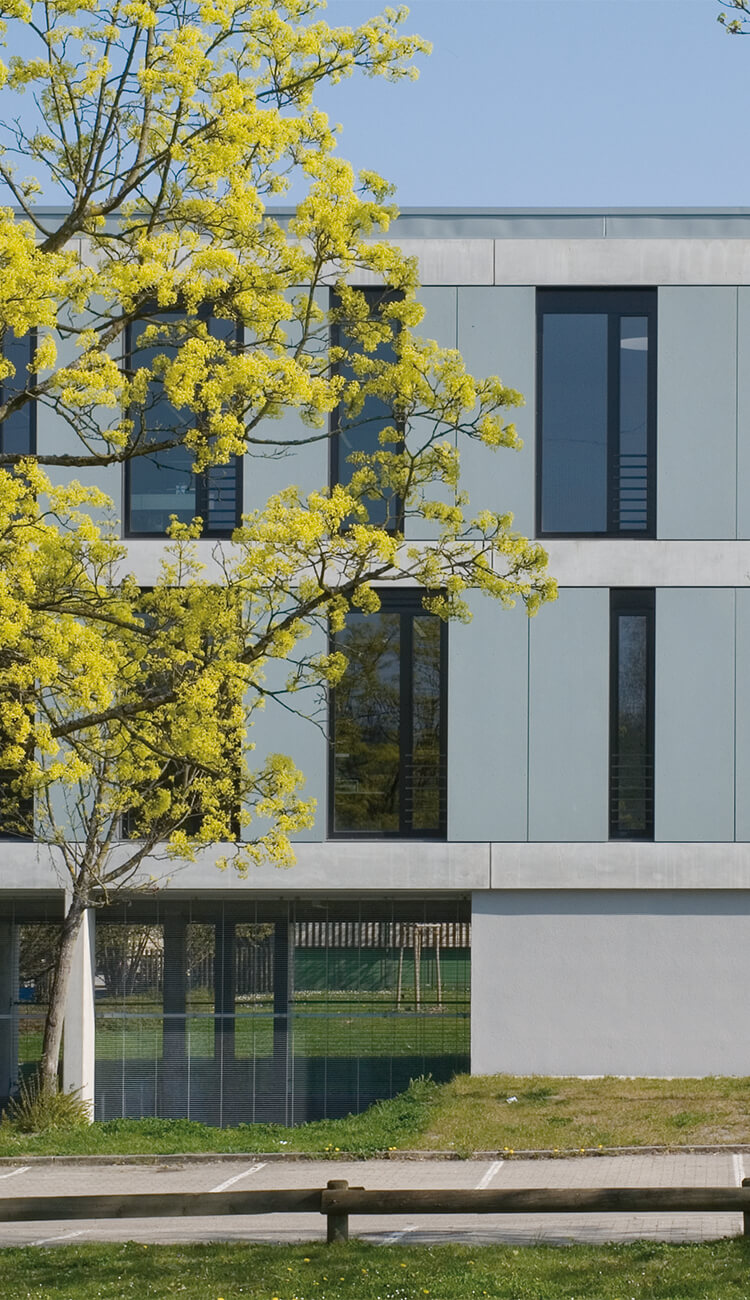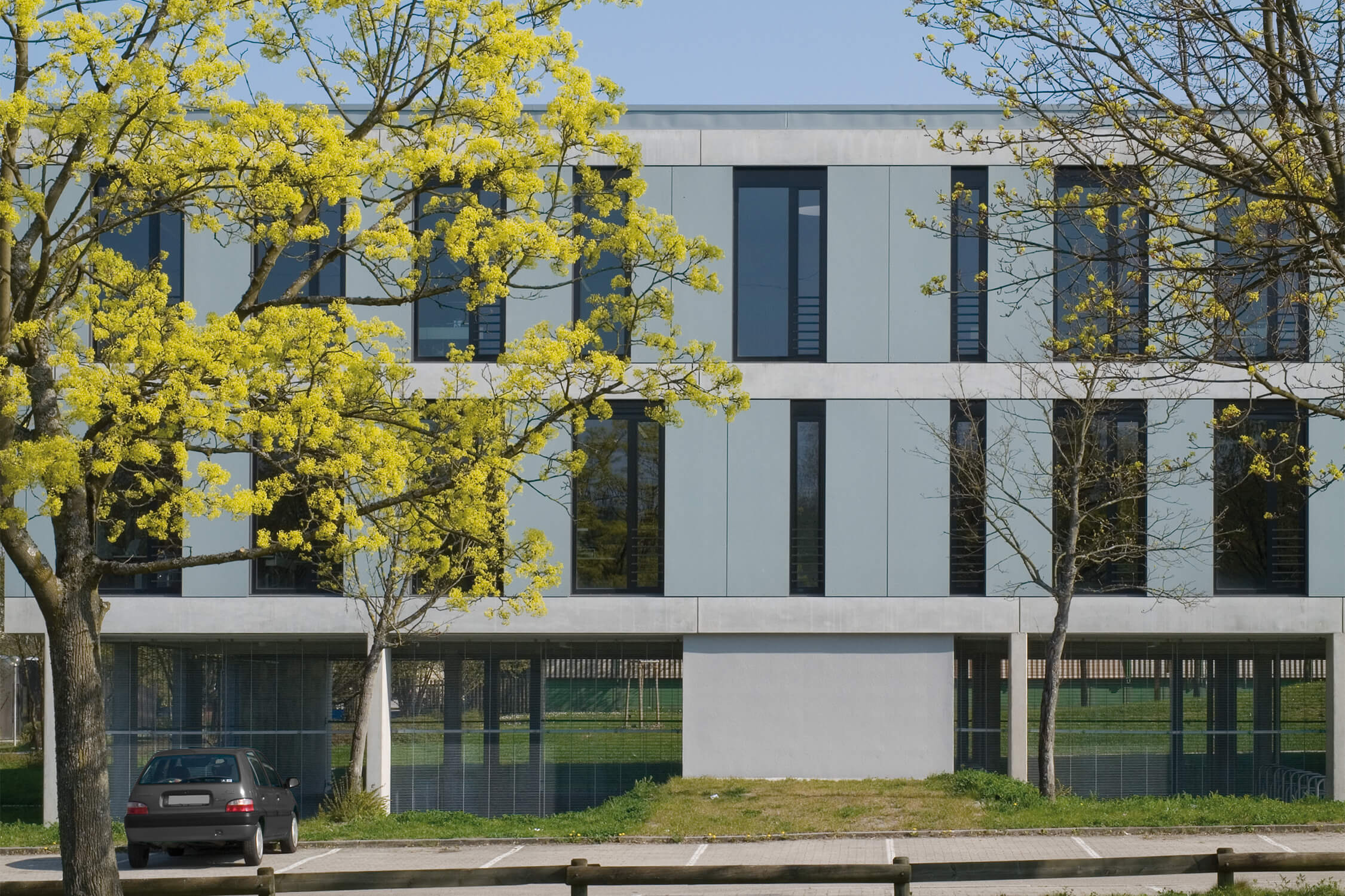 Die zweibündige Anlage ist mit einer natürlich belichteten inneren Erschließungszone besonders kompakt und damit sehr wirtschaftlich konzipiert. Raumhohe Fenster und vorgehängte Faserzementplatten stehen in Wechselwirkung zu horizontalen Betonfertigteilen im Deckenbereich. Im Innenraum kontrastieren Sichtbetonwände in rauer Brettschalung mit hochwertigen Holzelementen bei Fenstern, Schrankwänden, Zargen und Türen.