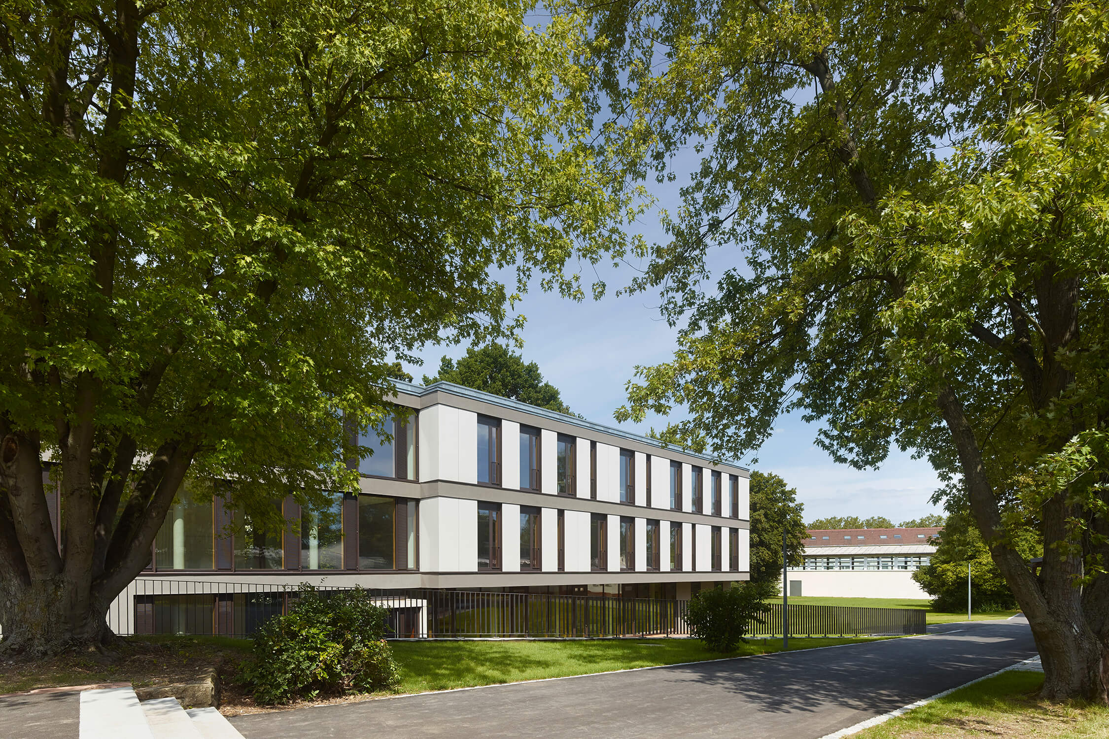 Eine Schulanlage aus den 50er Jahren mit dreigeschossigem Hauptbau und eingeschossigen Pavillonbauten war um eine Mensa, Schüleraufenthalts- und Fachklassenräume für Biologie und Physik zu erweitern. Der Neubau schließt direkt an den winkelförmigen Hauptbau an. Ein Zwischenglied nimmt den neuen Eingangsbereich, Treppe, Aufzug und WC-Räume auf. Der im Altbau südseitig angeordnete Flur wird hier auf die Nordseite des Neubaus umgeleitet, damit alle neugeschaffenen Räume in den Genuss der Südsonne und des Ausblicks in die grüne Mitte des Schulgeländes kommen.