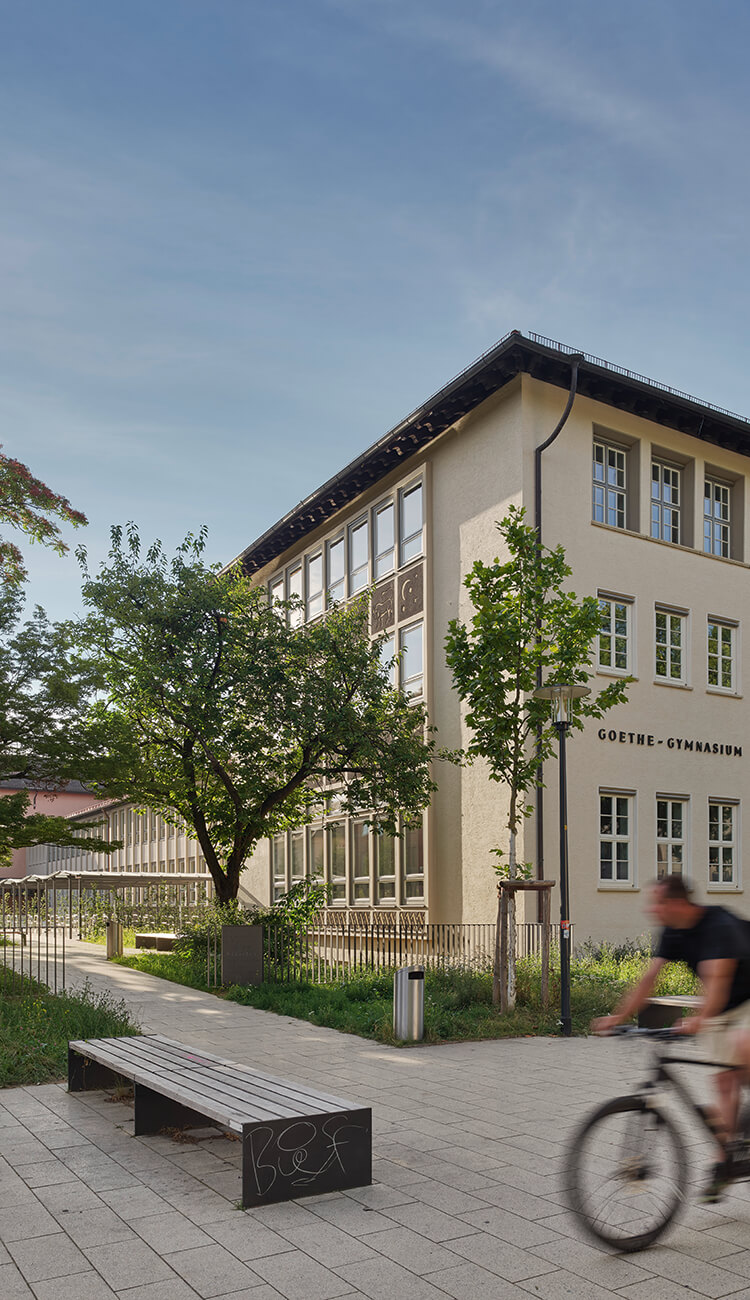 Das Goethe-Gymnasium Ludwigsburg besteht aus drei Gebäudetrakten: Während das 4-geschossige Hauptgebäude aus dem Jahr 1951 auf eine Planung aus der Vorkriegszeit zurückgeht, sieht man dem niedrigeren Zwischentrakt und dem Turnhallengebäude aus den späteren 1950er-Jahren die Nachkriegs-Moderne deutlich an. Das Ensemble steht nicht unter Denkmalschutz, trotzdem sollte bei der Generalsanierung der Charakter der Gebäude weitgehend erhalten bleiben.