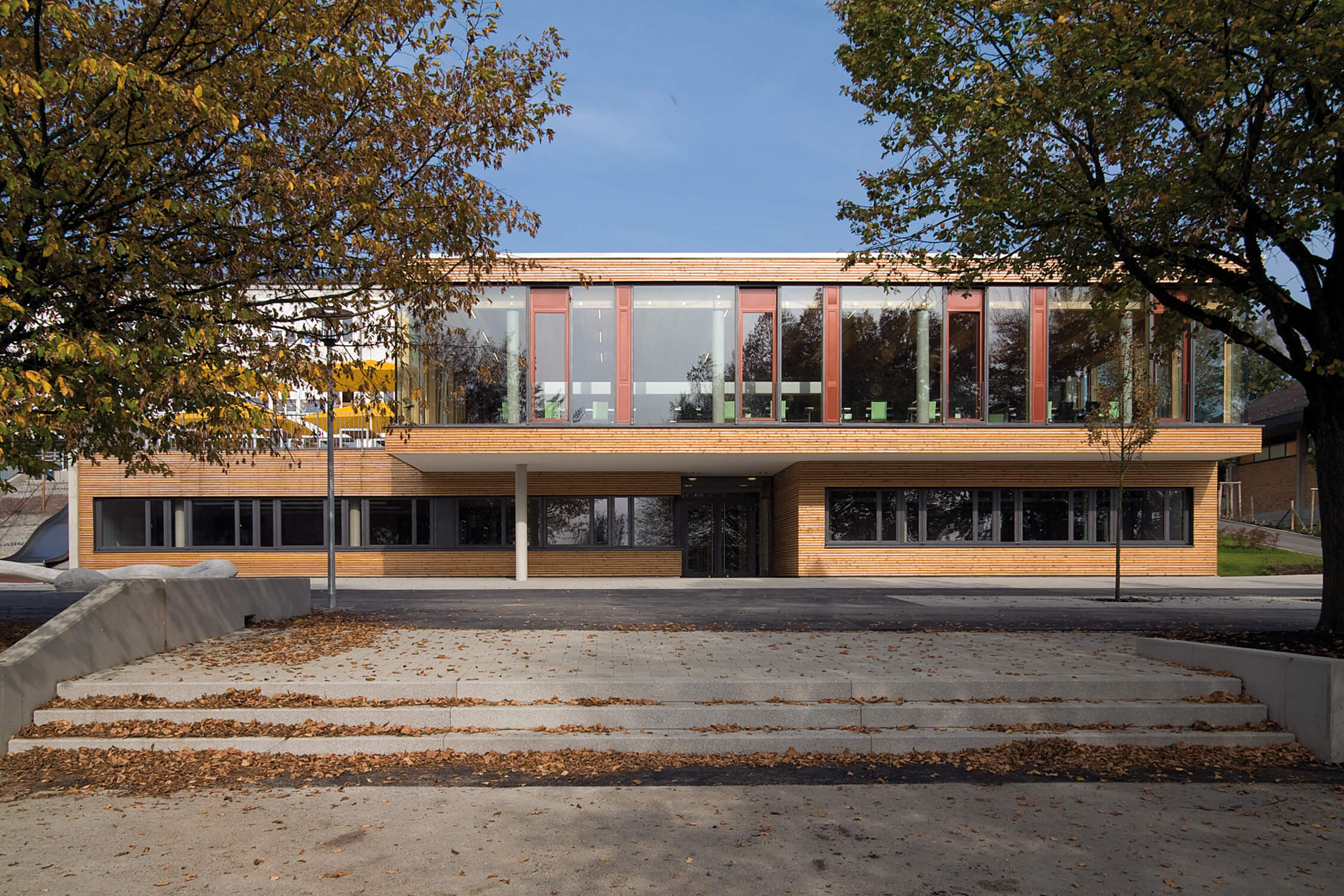 Auf Basis eines aufgestellten Entwicklungsplans für das gesamte Schulzentrum wurde die Mensa als quadratischer Pavillon auf einem Sockelgeschoss im Hang konzipiert. Gebäuderücksprünge markieren die Eingänge. Oben liegen der Speiseraum mit 144 Plätzen, Küche, Internetcafé und einige Nebenräume. Im Sockelgeschoss sind ein Multifunktionsraum, ein PC-Klassenraum und ein Büro angeordnet. Das zentrale Oberlicht erhellt den hinteren Teil des Speiseraums und das innenliegende Foyer. Beton- und Holzkonstruktionen sind sichtbar belassen, Fassaden mit horizontalen Lärchenholzstäben verkleidet. Beim Café wurde das Materialkonzept umgekehrt: Beton außen, innen Seekieferplatten. Schmale Lüftungsflügel gliedern die großen Glasflächen. Alle Materialien sind in ihrer farbigen Wirkung soweit möglich naturbelassen, während verputzte Flächen, Türen und Heizkörper in markantem Farbkontrast hellgrün gestrichen wurden.