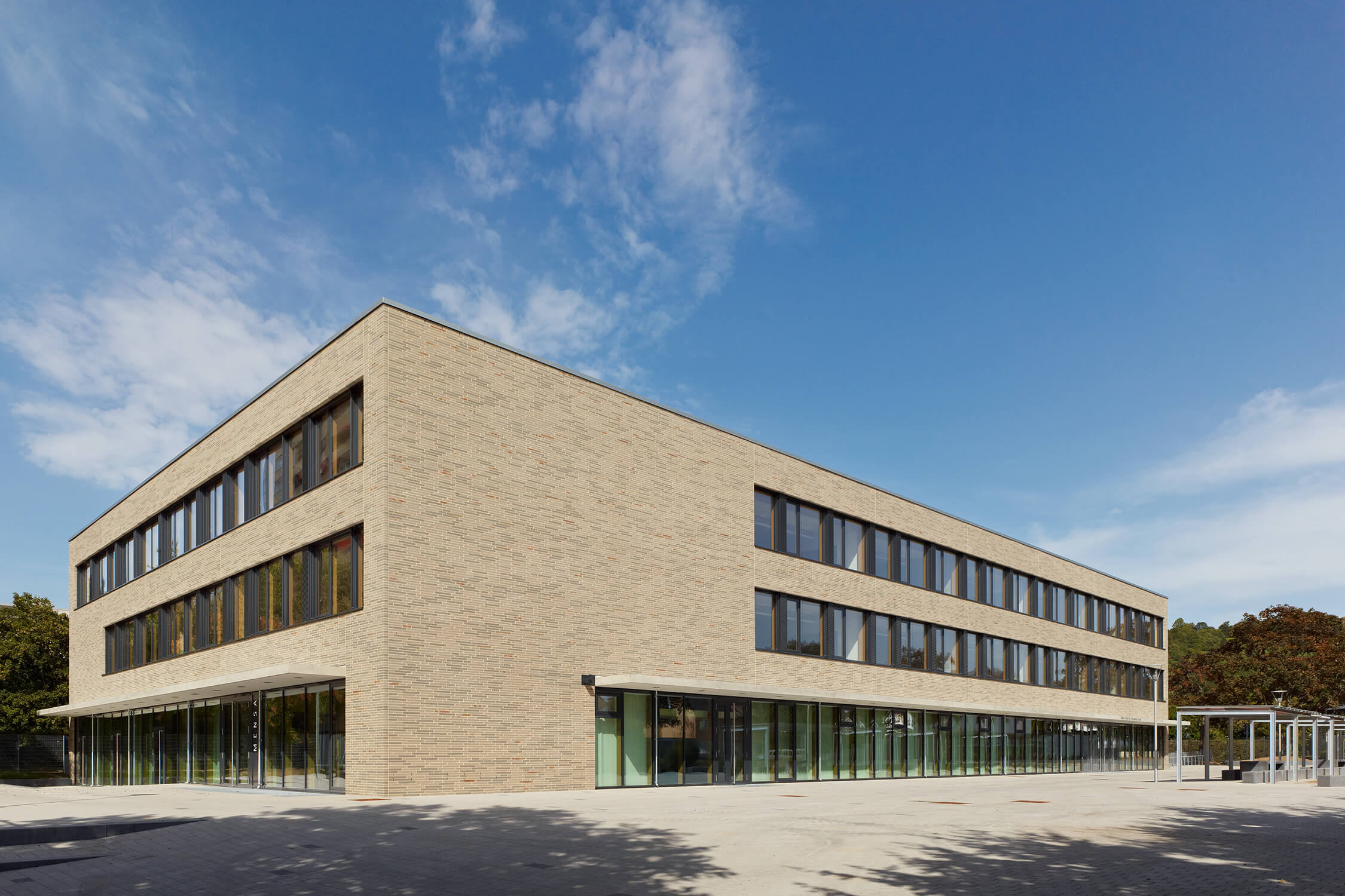 Das bestehende Schulzentrum mit Grundschule, Realschule und Sporthallen war um ein 2-zügiges Gymnasium zu ergänzen. Auf rechteckigem Grundriss entwickelten wir einen kompakten 3-geschossigen Baukörper. Im Erdgeschoss liegen Räume für die Verwaltung, Aufenthaltsräume für die Ganztagesbetreuung und eine Mensa mit 145 Plätzen.