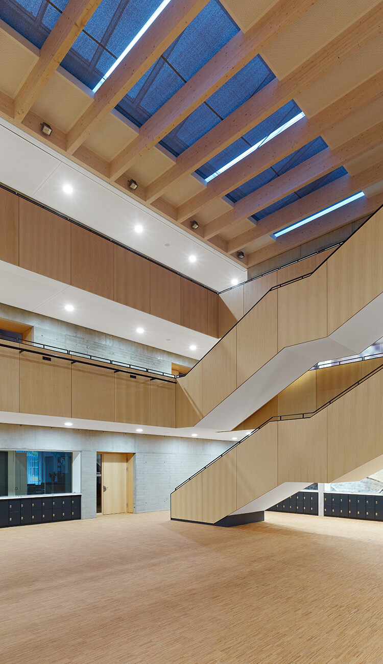 Das lichtdurchflutete Atrium ist mit dem Musikraum zu einer Aula koppelbar. Offene Treppen führen in die beiden Obergeschosse. Dort liegen an den Außenfassaden alle 28 Klassen- und Fachräume sowie eine Bibliothek. Neben-räume werden über die beiden Atrien belichtet. Klare Bauform, kontrollierte Lüftung mit Wärmerückgewinnung, Fotovoltaikanlage, Fernheizung und eine gute Wärmedämmung ergeben energetisch ein 2-Liter-Haus oder auch: ein „Passivhaus nach gesundem Menschenverstand“, nämlich ohne exorbitante Mehrkosten für das letzte Quäntchen Energieeinsparung.