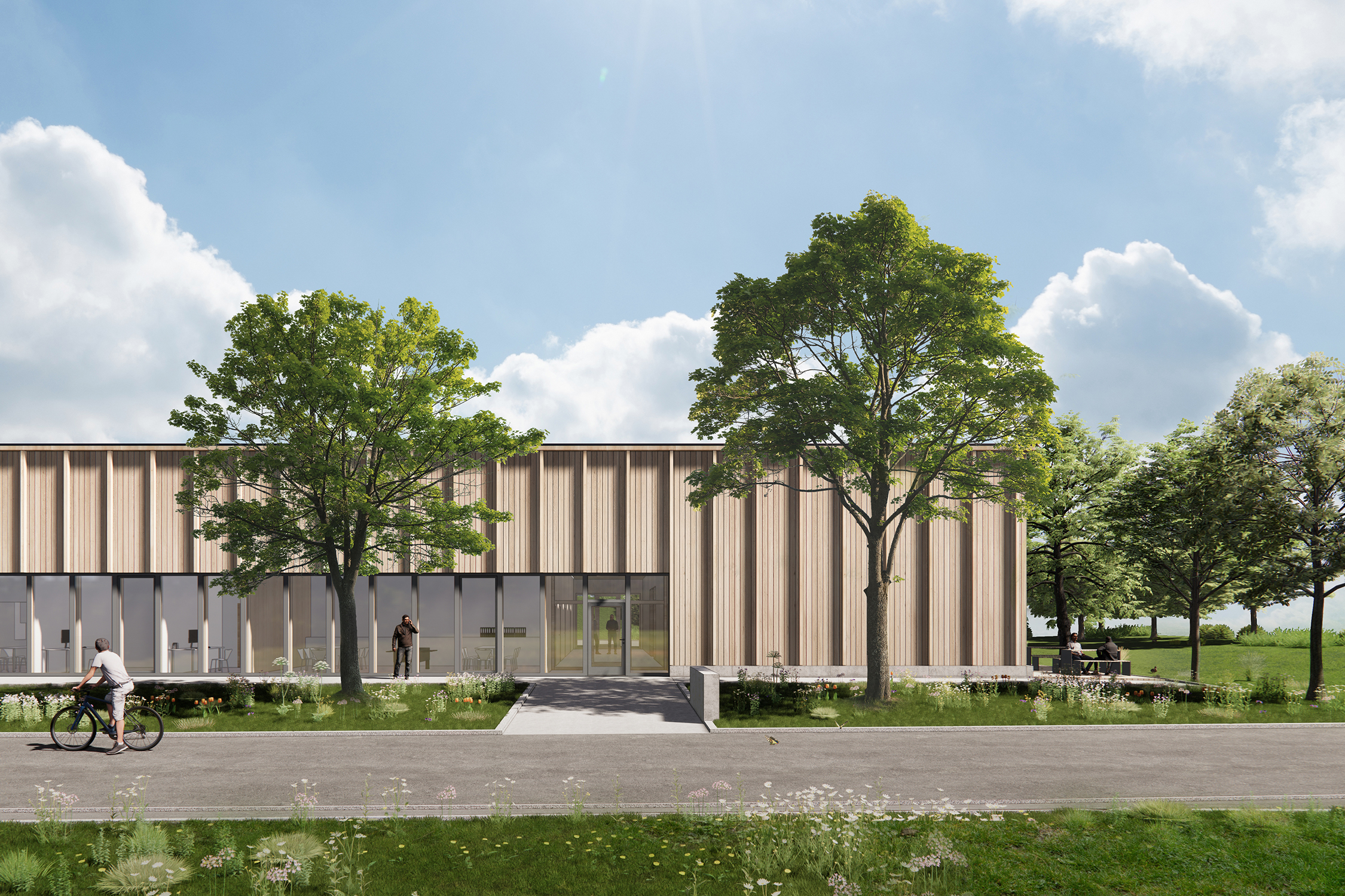 Der Holzbau, geplant auf einer Stahlbeton-Flachgründung, zeichnet sich durch einen hohen Vorfertigungsgrad aus. Die Konstruktion bleibt innen sichtbar, um die Materialität des Holzes zu betonen. Außen wird dies durch eine vertikale Holzschalung mit Lisenen fortgeführt, welche der Länge des Gebäudes entgegenwirkt.