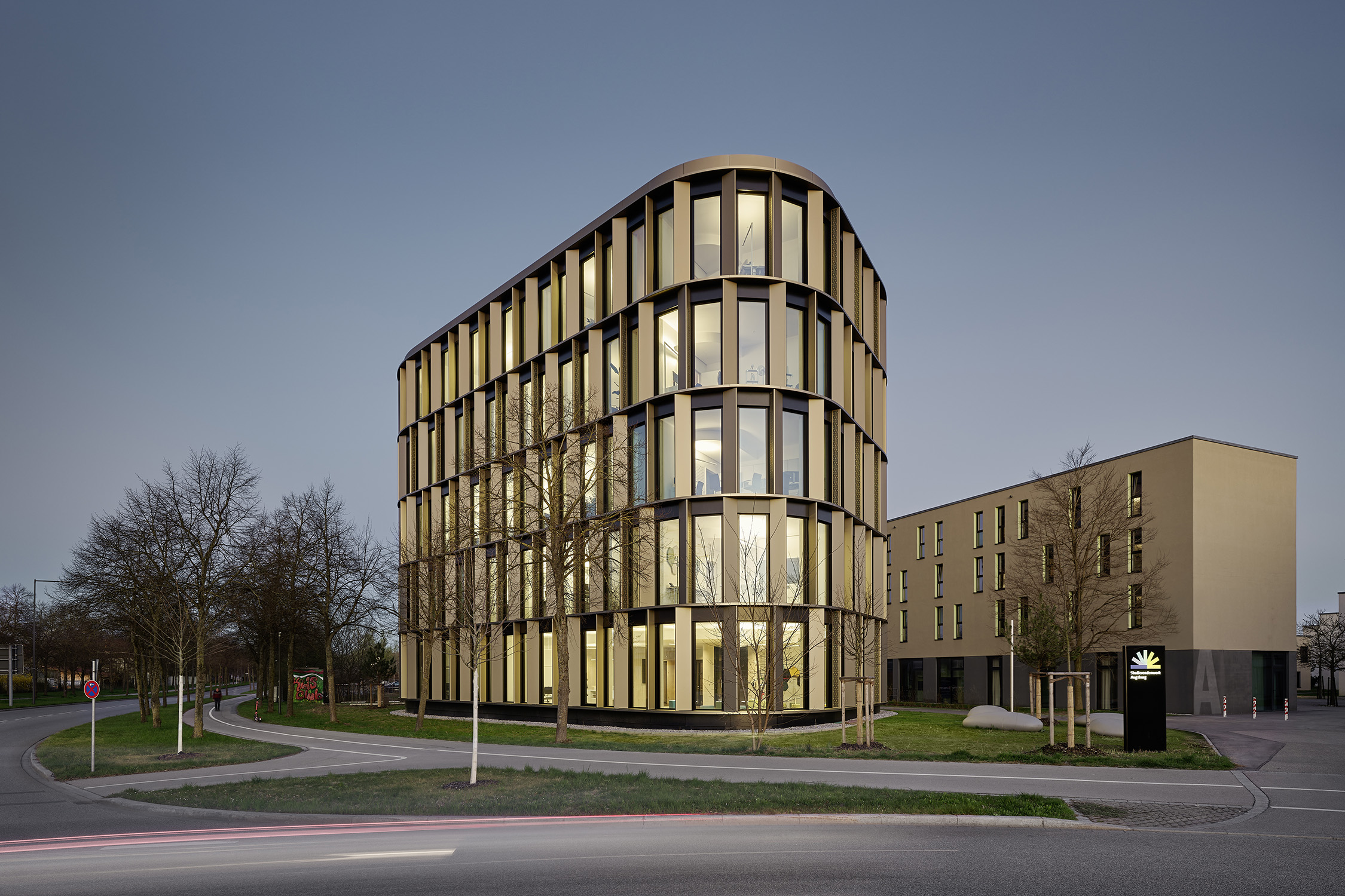 In seinem neuen Domizil nahe dem Uni-Campus bündelt das Studierendenwerk Augsburg alle Abteilungen und bietet eine zentrale Anlaufstelle für die Anliegen der Studierenden – von juristischer Beratung, über BAFöG bis Wohnheimplatz. Mit der stark profilierten Metall-Glas-Fassade und den abgerundeten Kanten auf einem Fünfeck-Grundriss gibt sich das ungerichtete Gebäude klar als Sonderbau zu erkennen und wirkt als Identitätsträger für das ganze Quartier.