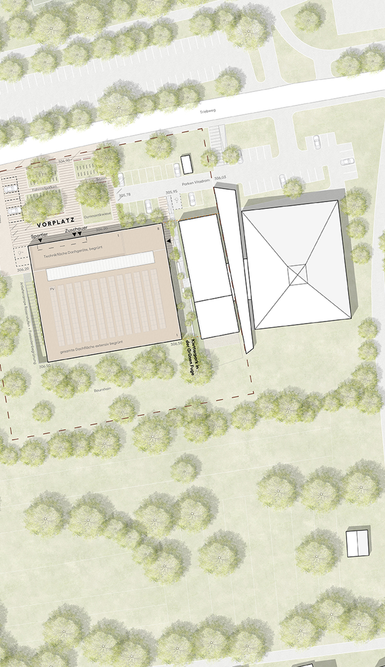 Die Stadt Stuttgart plant einen Neubau einer Sporthalle im Sportpark Feuerbach für Schul-, Vereins- und Freizeitsport. Unser kubischer Neubau bildet zusammen mit bestehenden Gebäuden des örtlichen Sportvereins ein städtebauliches Ensemble. Durch die neu geschaffene Zugangssituation entsteht ein einladender und durchgrünter Vorplatz. Direkt an den Eingangsbereich angegliedert liegt der multifunktional nutzbare Gymnastikraum, der sowohl zum Vorplatz als auch zum Zuschauerbereich geöffnet werden kann. Im Untergeschoss liegen die Umkleidebereiche und der Hallenraum. Der Neubau wird abgesehen von den erdberührten Bauteilen als reiner Holzbau mit begrünter Fassade vorgeschlagen. Das gesamte Projekt wird vollumfänglich in BIM umgesetzt.