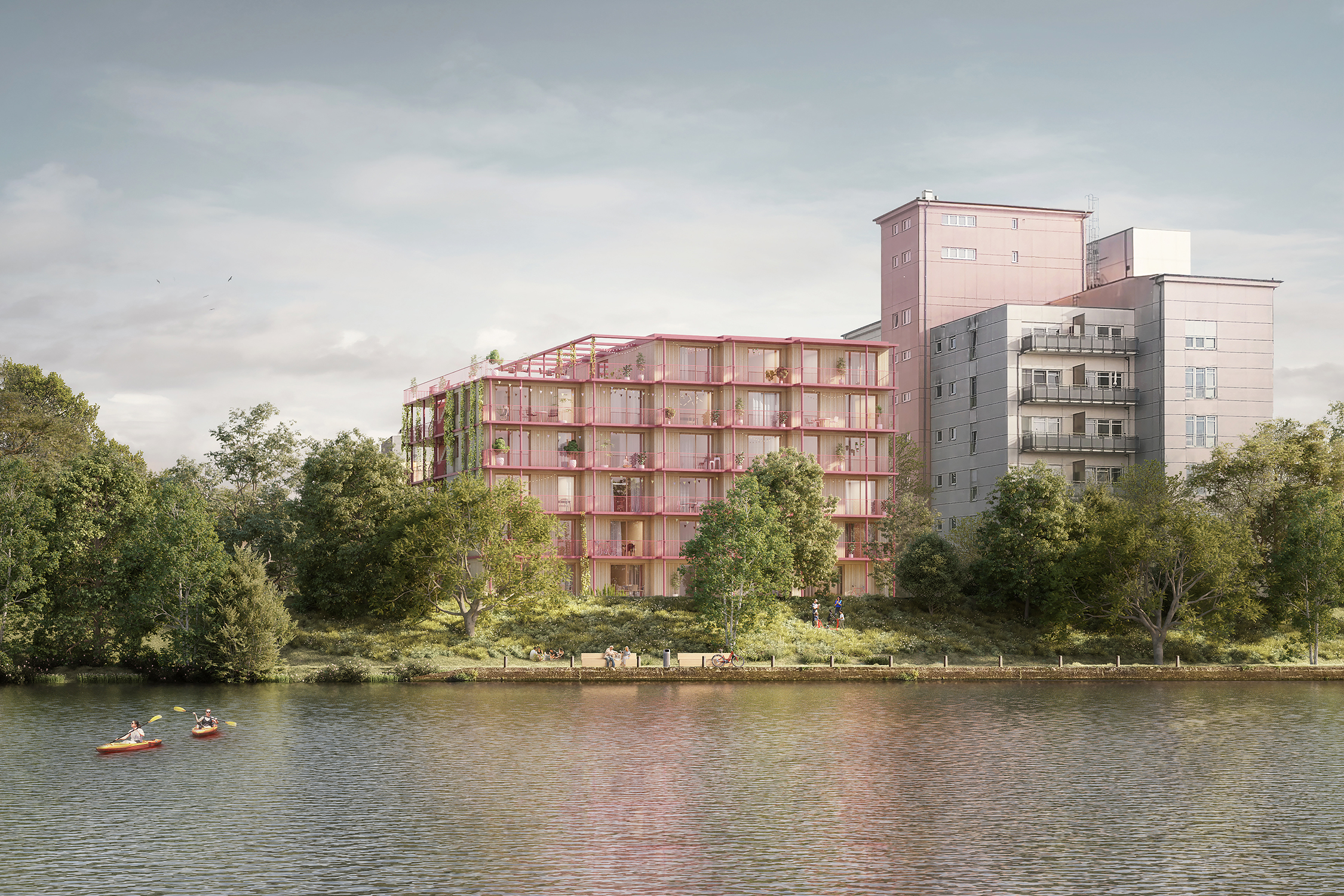 Unser Entwurf konnte bei der anonymisierten Mehrfachbeauftragung mit sechs Teilnehmern die Jury überzeugen. Auf dem reizvollen Grundstück direkt am Neckar gelegen sollen nun auf einem Sockelgeschoss aus Stahlbeton 6 Geschosse mit 51 betreuten Wohnungen in Holzbau errichtet werden. Als besonderes Highlight findet sich auf dem Dach ein Bewohnergarten mit traumhaftem Ausblick ins Neckartal.