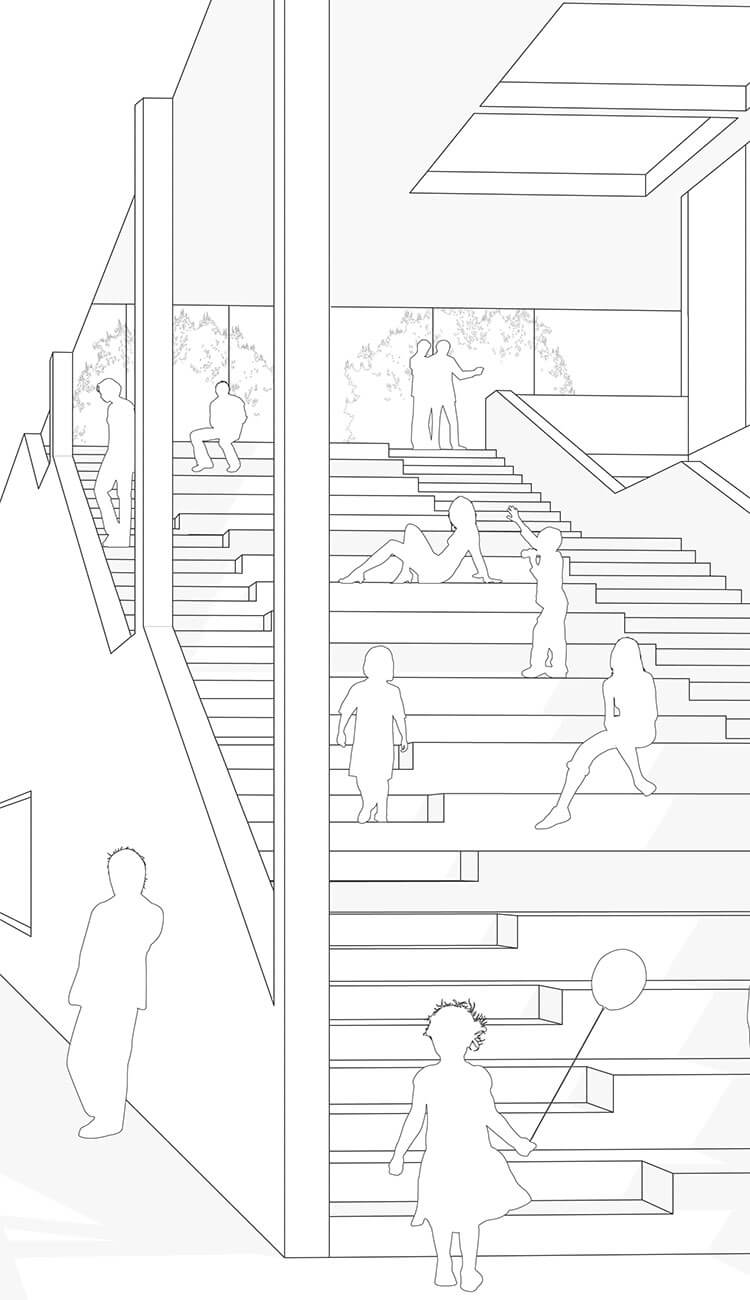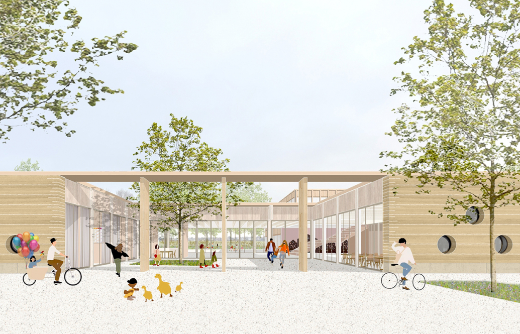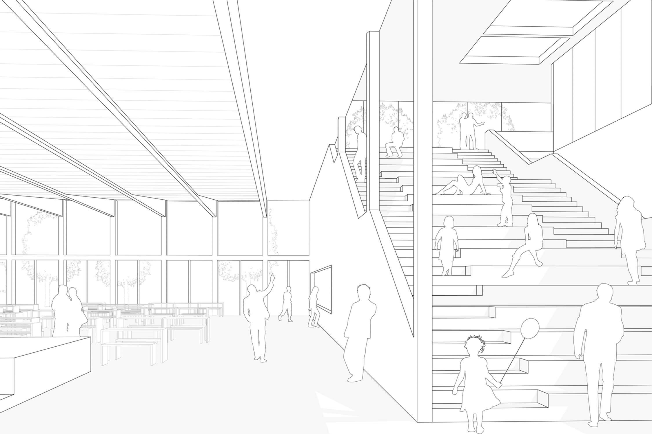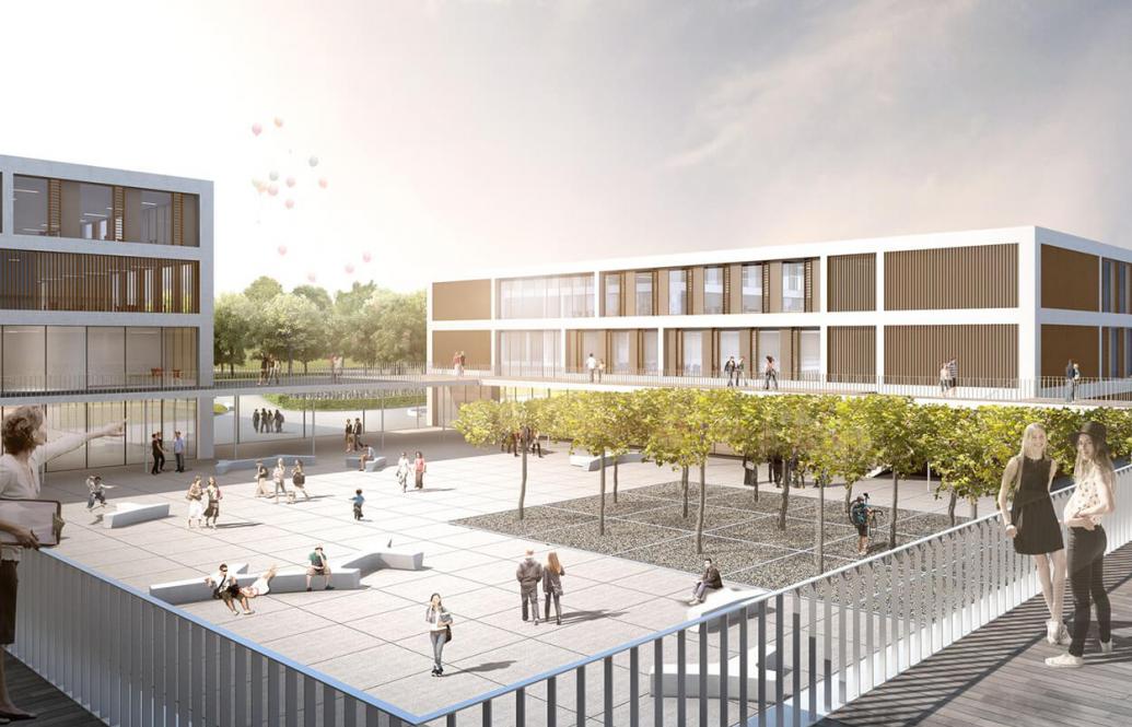 Die Neubaumaßnahme des Schulstandortes besteht aus drei Bausteinen: das Schulhaus, das Kulturhaus und die Sporthalle. Erstes positioniert sich im Süden des Blocks und bildet so zusammen mit den historischen Kasernengebäuden eine starke städtebauliche Kante entlang der Kaiserstraße. Das vierstöckige Schulhaus ist bewusst von der Vorderkante der Kasernengebäude abgerückt, um die Bestandshäuser im Straßenraum wahrnehmbar zu machen. Das quadratische Schulhaus sitzt zurückversetzt, wodurch ein öffentlicher Quartiersplatz entsteht. Die Sporthalle positioniert sich entlang der Heinrich-Schweizer-Straße neben der Bestandssporthalle. Zwei unterschiedlich Zugänge für Basketball und Schulsport werden durch den Höhenversatz erreicht.