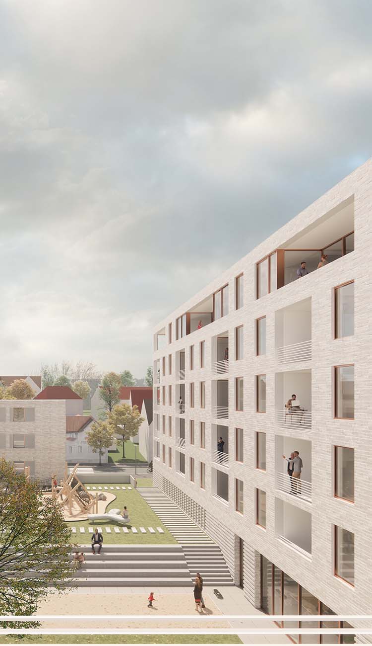 „Durch eine leichte Abweichung vom Rahmenplan wird gegenüber des vorhandenen Ärztehauses ein zusätzlicher funktionaler und ausgestalteter Vorplatz geschaffen, dessen Qualität über die Mittelachse ins Quartier hineingezogen wird. Die Abstufung der Gebäudehöhe des Pflegeheims schafft an dieser Stelle eine großzügige Dachterrasse als zusätzlichen Freiraum. Beide Elemente werden vom Gremium begrüßt.... Besonders gelungen ist zudem die durchdachte Funktionszuordnung der Freiflächen in Abhängigkeit zur angrenzenden Baukörpernutzung. Auch der Vorplatz ist qualitätsvoll mit Öffnung zum Bäcker und zum Quartiersplatz gestaltet. Durch halb in den Baugrund eingelassene Parkdecks erhalten die Wohngeschosse durch die Ausbildung einer Hochparterre geschützte und private Innenräume. Die homogene in sich ruhende Fassadengestaltung – einheitlich für das gesamte Quartier – wirkt solide.... Besonders die gut gelösten funktionalen und inhaltlichen Anforderungen in einem sehr hohen Detaillierungsgrad überzeugen. Die einander zugewandte Anordnung der Kita und des Pflegeheims ist sehr gut vorstellbar und wird positiv bewertet im aufgezeigten Zusammenspiel. Zudem überzeugen die vorgesehenen Grundrisse mit Ausbildung von Penthousewohnungen im obersten Geschoss mit einem hohen Anteil an Süd-West-Ausrichtung auch im südlichen Baufeld. Das Pflegeheim ist überwiegend Ost-West ausgerichtet, was vom Gremium begrüßt wird.... Der Entwurf überzeugt besonders mit seiner homogenen Ausgestaltung, welche sich wie selbstverständlich in die Umgebung einfügt und qualitätsvolle Freiräume schafft.“