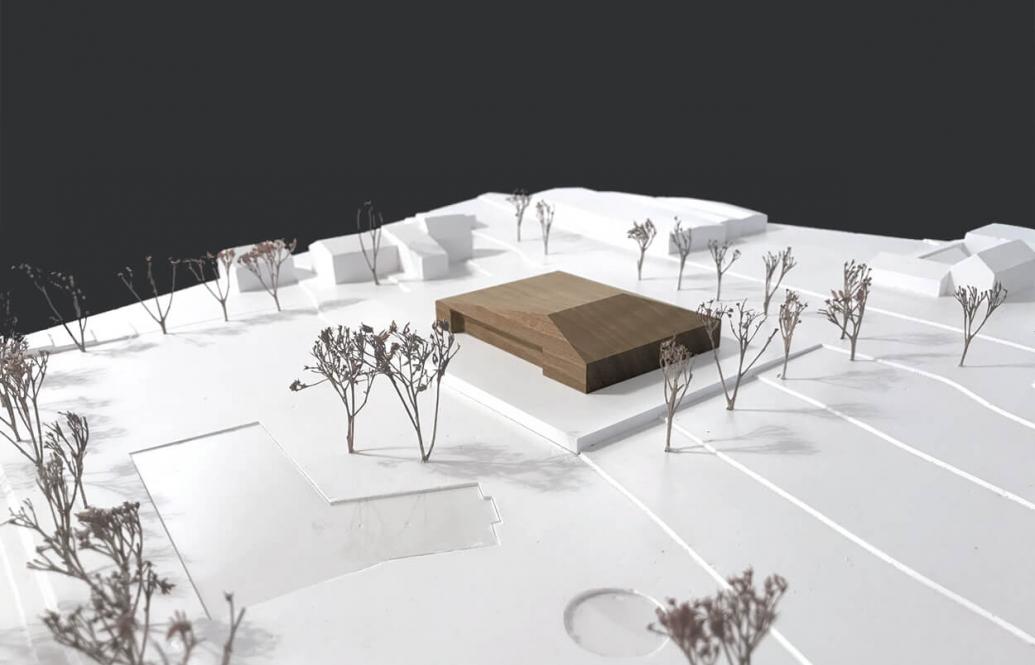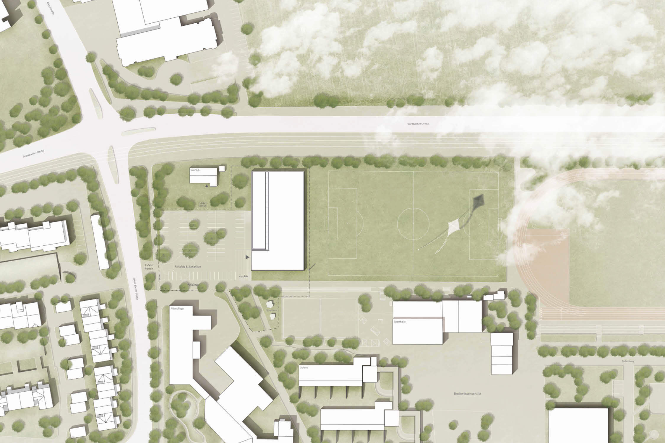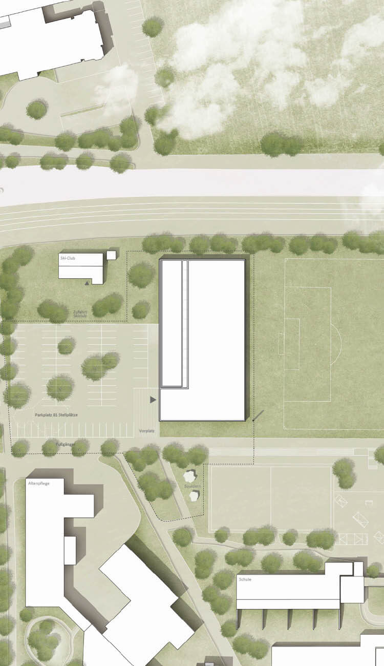 Ziel des Entwurfs ist es eine harmonische Einfügung in die umgebende Bebauung, eine gut auffindbare Erschließung und einen kreuzungsfreien Verkehr zwischen Fußgänger:innen und Autos zu schaffen. Daraus resultiert die gewählte Lage der Sporthalle und das Eingraben um ein Geschoss. Mit ihren Längsseiten orientiert sich die Halle zum Parkplatz bzw. den neuen Sportanlagen und ist dadurch abgewandt von der durch Bahn- und Autoverkehr lärmintensiven Nordseite.