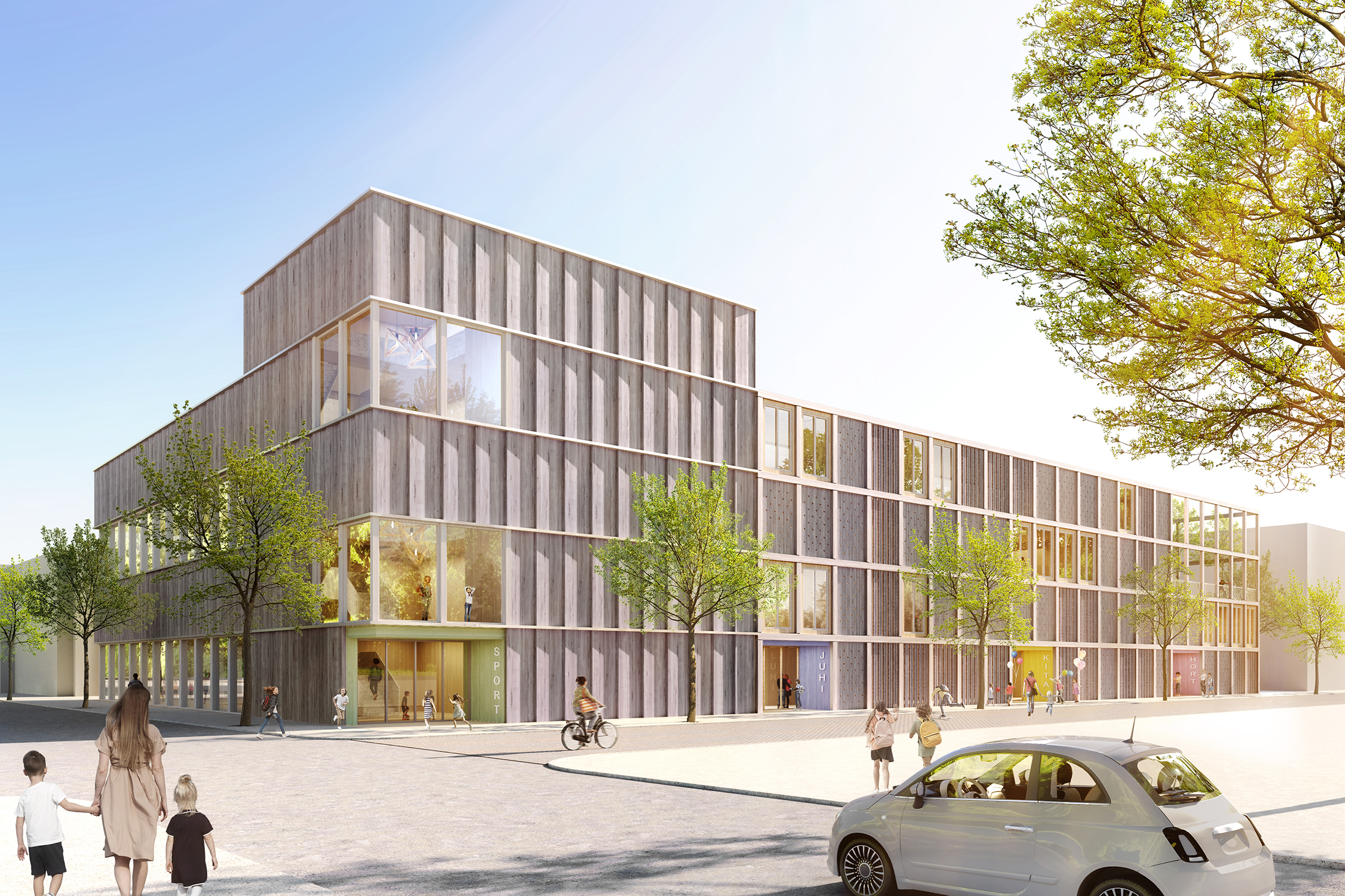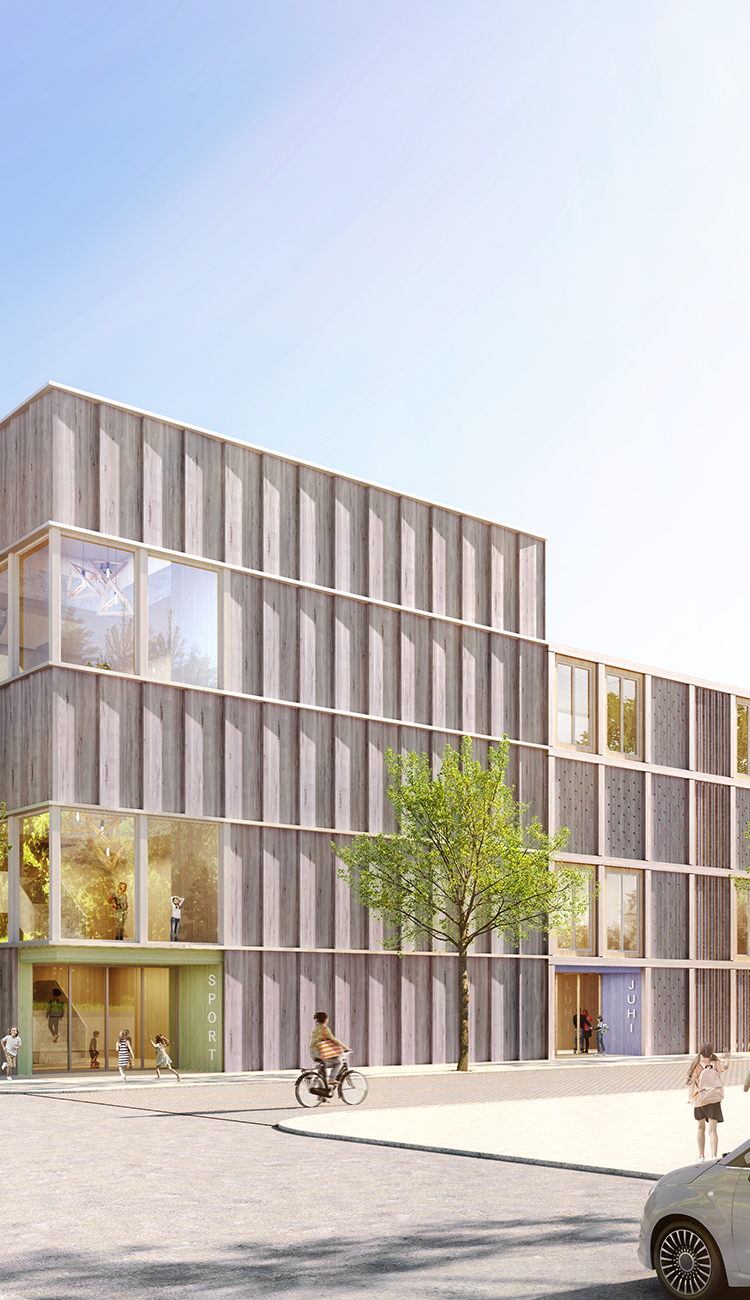 Vier farbig markierten Eingänge entlang der Hohe Straße bilden für jeden einzelnen Nutzer eine klar ablesbare Adresse. Die Bausteine der Kita, des Horts und der Jugendhilfe werden durch eine durchgehend gerasterte Fassade gegliedert. Diese Struktur zieht sich als „Grid“ mit unterschiedlichen Füllungen über die gesamte Fassade. Zum Innenhof staffelt sich das Gebäude in der Tiefe zurück und schafft somit spannende Außenräume, für die Terrasse der Kita und den Dachgarten des Horts. Der gesamte Neubau wird als eine Holzfassade ausgebildet.