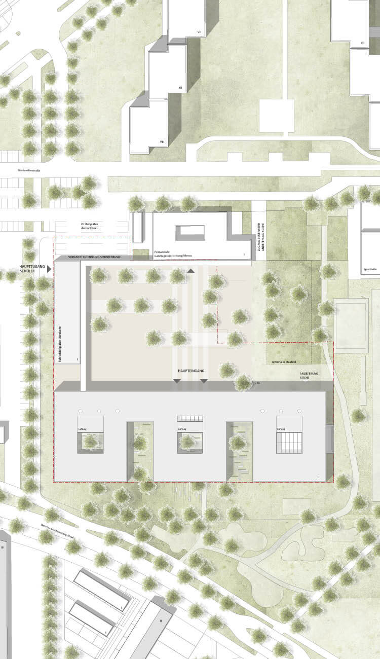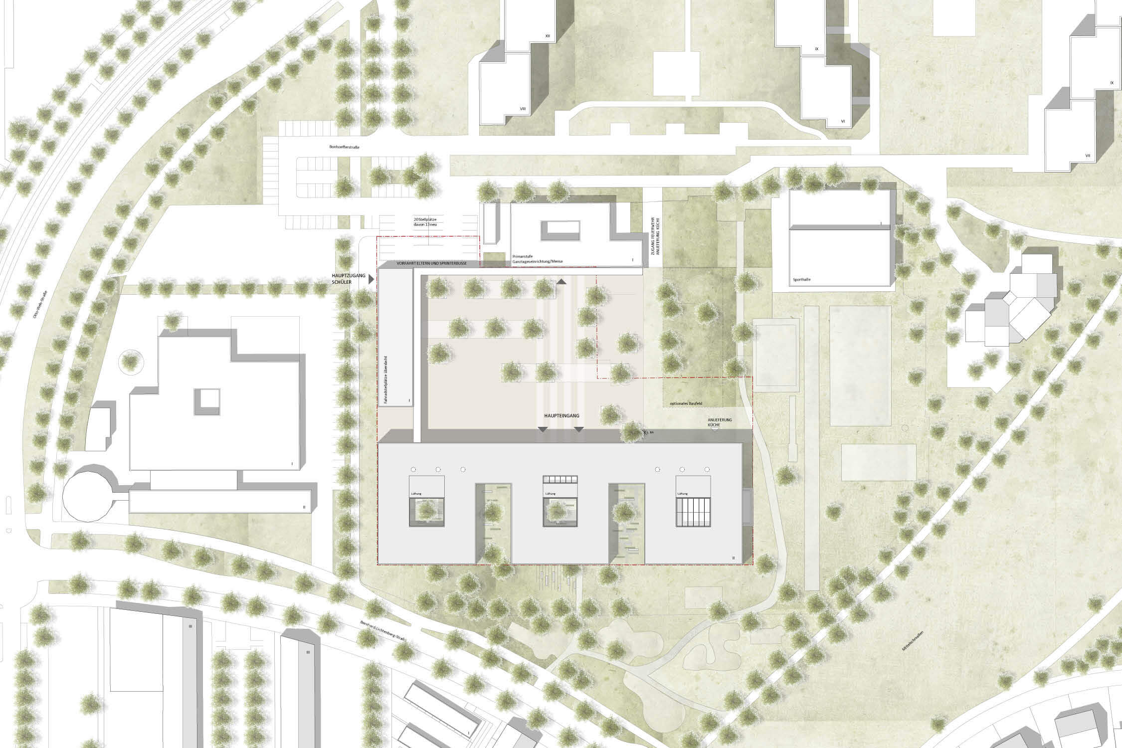 Der Baukörper gliedert sich auf der Südseite in drei gleich große „Schulhäuser“, die drei Jahrgangscluster im Obergeschoss aufnehmen, der vierte ist im wesentlichen im Erdgeschoss angelegt. Das neue U-förmige Ensemble öffnet sich zum angrenzenden Sportareal und dem Grünzug im Osten und definiert nach Westen und Norden ein zusammenhängendes Schulareal.