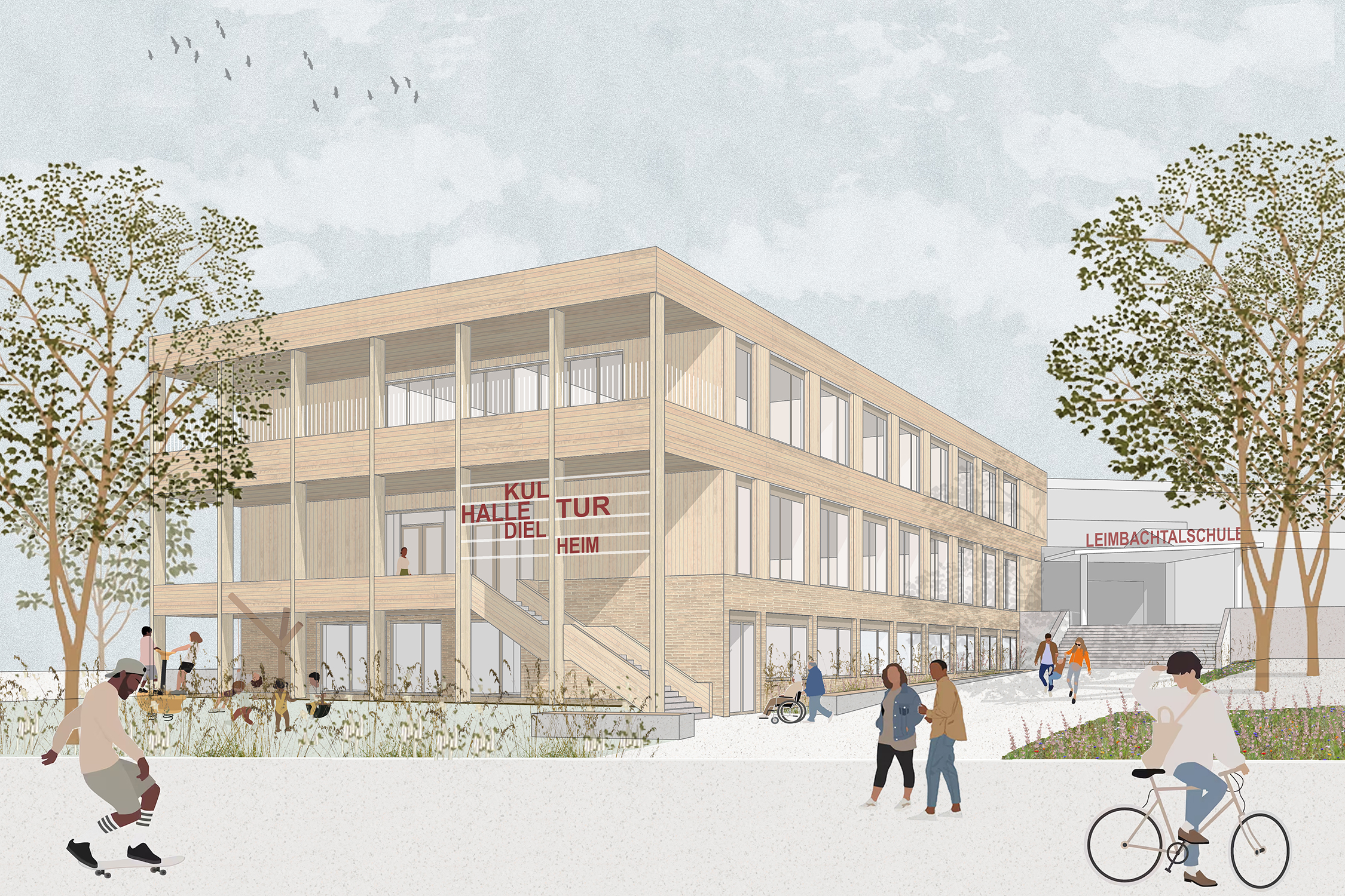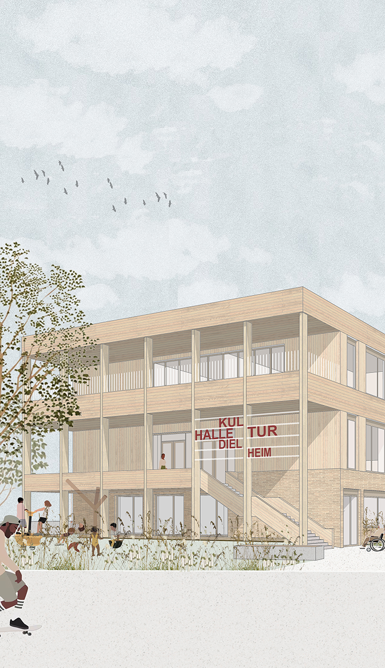 Die in die Jahre gekommene Kulturhalle der Gemeinde Dielheim wird rückgebaut und an gleicher Stelle neu errichtet. Ergänzend entstehen neue Klassenräume für die Leimbachtalschule. Das bestehende Lehrschwimmbecken im Sockelgeschoss bleibt erhalten und wird im Rahmen des Projekts saniert. Unser Wettbewerbsbeitrag versteht sich als ganzheitliche Konzeption, die funktionale und pädagogische Anforderungen von Schule und Kulturhalle mit einer städtebaulichen Neuordnung der Zugänge und Adressen auf dem Schulgelände vereint.