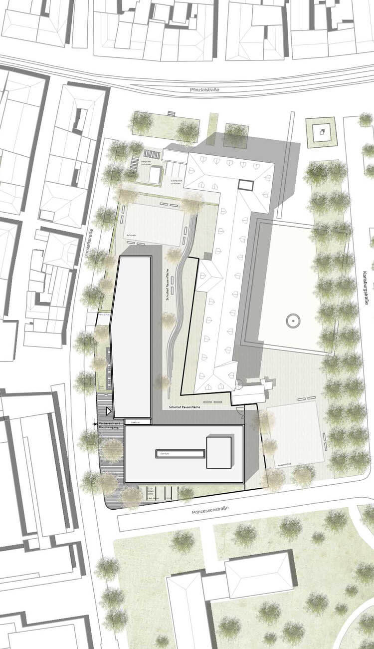 Der Neubau ergänzt den Bestandsbau und bildet mit ihm zusammen eine neue raumbildende Einheit. Durch den schlanken Baukörper entsteht eine maximal geschützte Schulhoffläche, die zusammen mit den Raumkanten des Schlosses einen prägnanten Innenraum schaffen. Über den verglasten Eingangsbereich gibt es eine direkte Sichtbeziehung zum Schulhof und auf das Schloss.