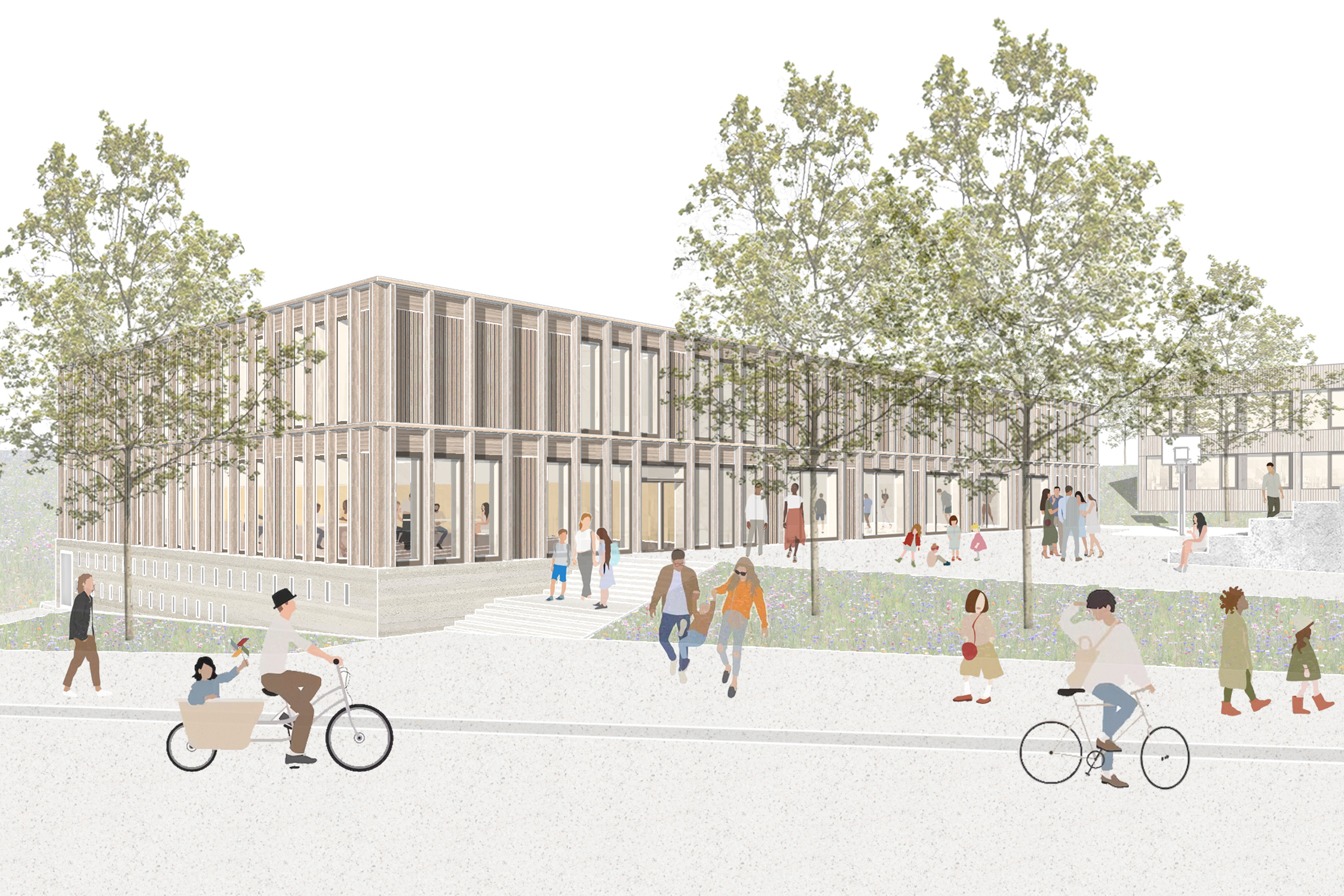 „Die Verfasser:innen präsentieren zwei neue Baukörper an der Klingenstraße, die mit den Bestandsbauten ein L-förmiges Ensemble formen und einen großzügigen südseitigen Freiraum ausbilden. Die Mensa und Ganztagsbetreuung wird straßenseitig mit einem neuen Kopfgebäude an die bestehende Turnhalle gesetzt. Den Neubau der Grundschule bildet ein 3- geschossiger Kubus, der über Eck im Bereich des Hauptzugangs an das bestehende Schulgebäude gesetzt wird. Alle Neubauten sind konsequent aus Holz geplant... Als Bindeglied wird vor dem Gebäudebestand und der neun Grundschule eine Überdachung gespannt. Das eingeschossige Dach mit Öffnungen formuliert ein beruhigendes Fassadenelement, das die 3 bauzeitlich diversen Gebäude zusammenführt... Dem Neubau sind dem „cradle to cradle“ Prinzip folgend, Fluchtbalkone aus feuerverzinktem wiederverwendbarem Stahl vorgesetzt, die auch der Verschattung der Fensterflächen dienen. Der Holzbau soll aus heimischen Hölzern erstellt werden. So gelingt es der Arbeit in Bezug auf Nachhaltigkeit, Hüllfläche, A/V Verhältnis und Energiebedarf zu punkten... “