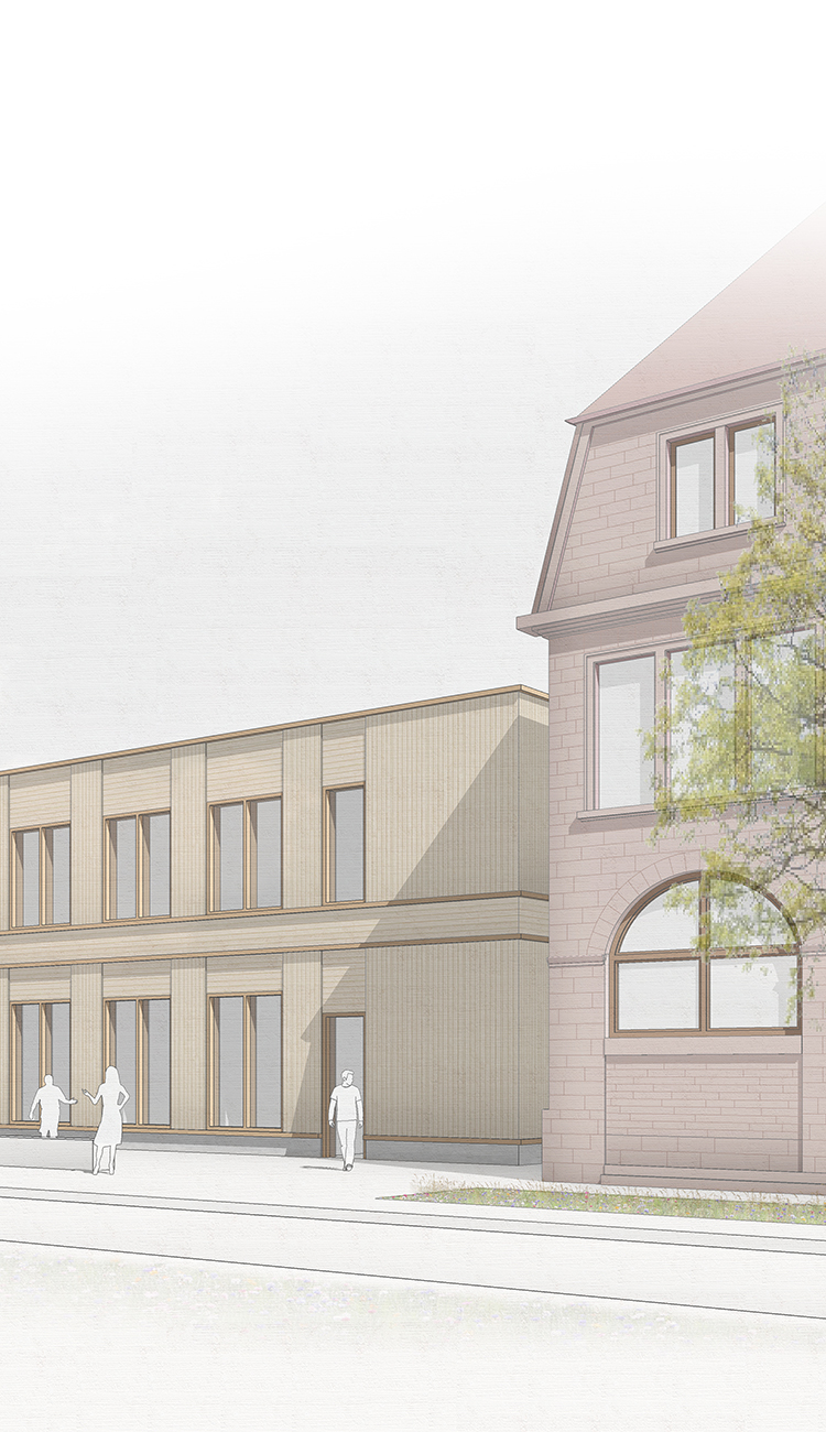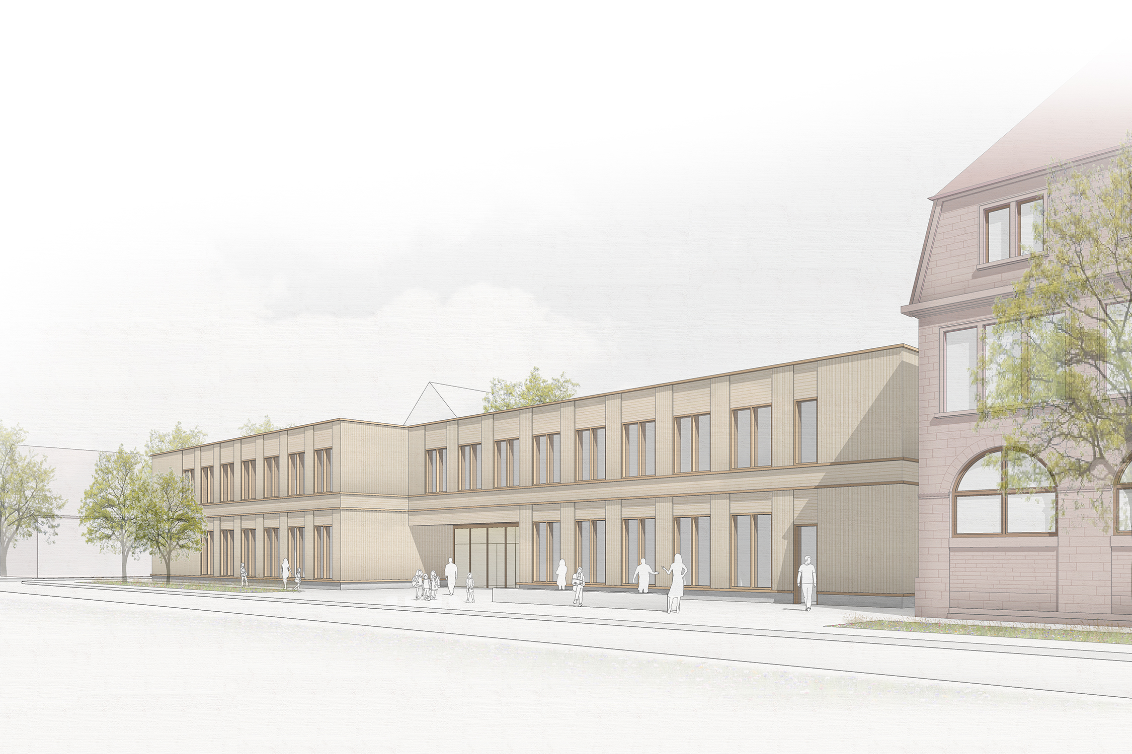 Der Entwurf sieht aus ökologischen und stadtbaugeschichtlichen Gründen einen kompletten Erhalt der historischen Bausubstanz vor und ergänzt durch einen neuen Holzbau mit den Räumlichkeiten für Mensa, Ganztag und Lehrerbereich. Dieser dient als Bindeglied zwischen den Bestandsgebäuden und definiert die neu Mitte des Schulcampus. Um trotz der vielen Baumasse einen großzügigen Pausenhof zu erhalten, wird die Zweifeldhalle komplett unter diesem eingegraben.