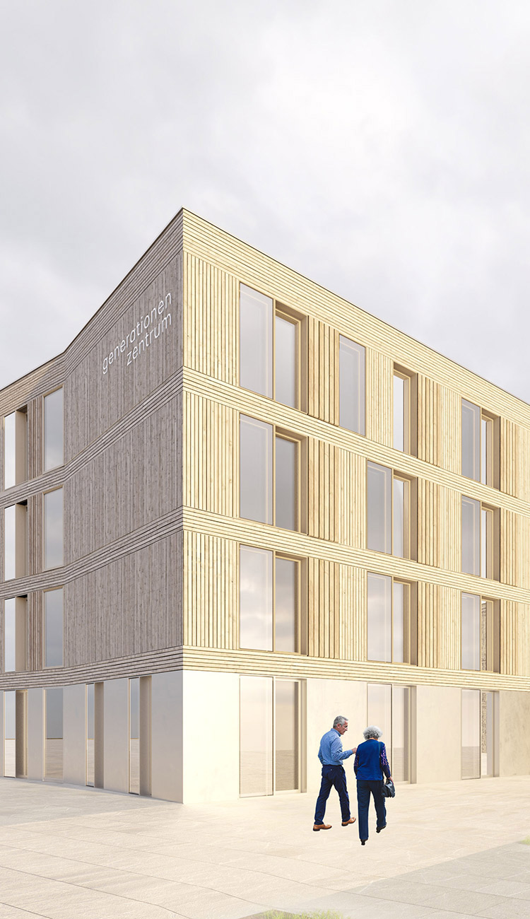 Neubau eines Generationen Zentrums mit Wohn- und Pflegeeinrichtungen für Senioren in einem Regensburger Stadtteil.