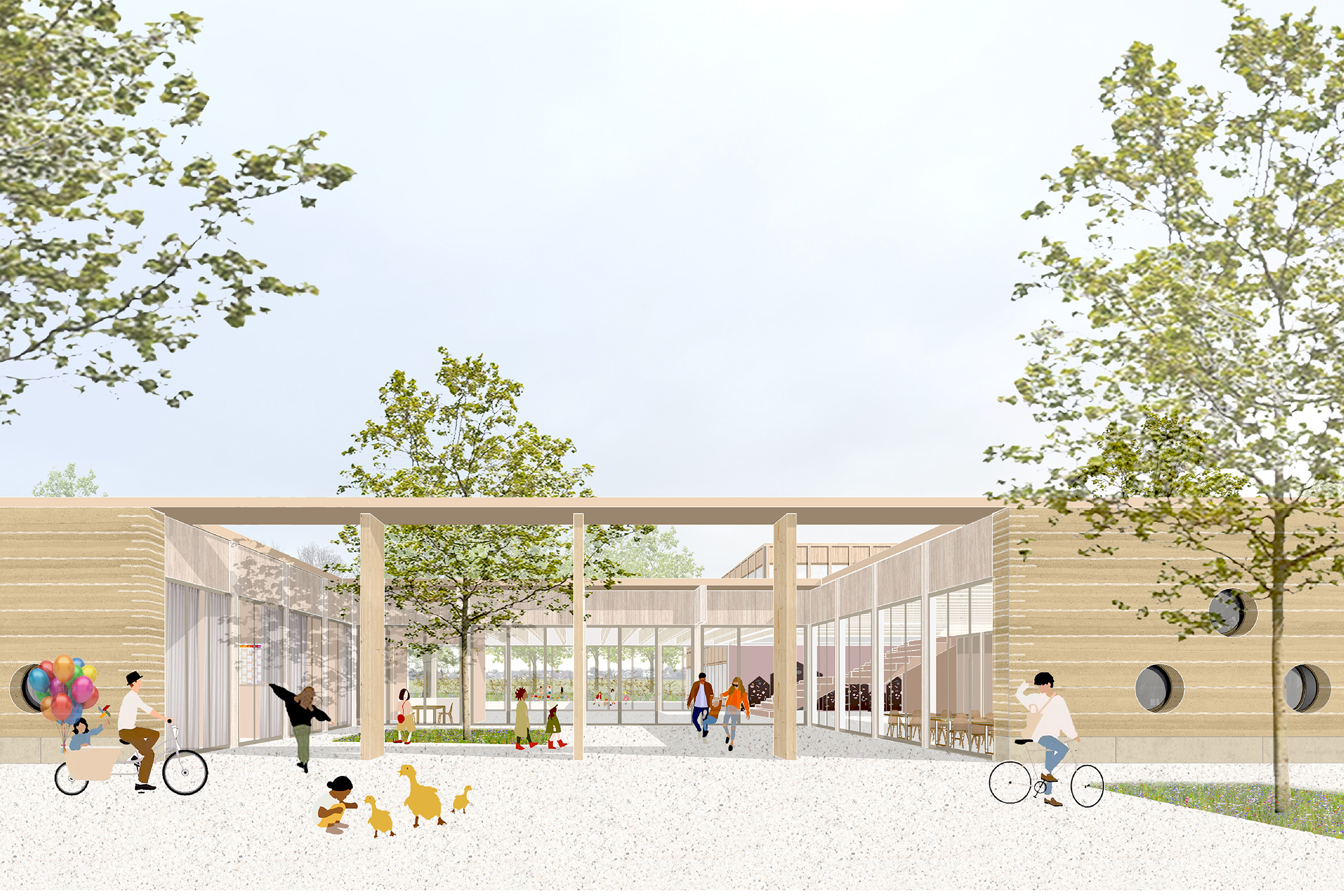 In die Gebäudevolumen eingeschnittene Höfe verweben das Schulhaus mit den angrenzenden Freianlagen und bringen Tageslicht ins Innere. Das dem Eingangshof vorgelagerte, hölzerne Portal empfängt die Schüler:innen am Morgen - ein Hofbaum geleitet den Weg zum Haupteingang.