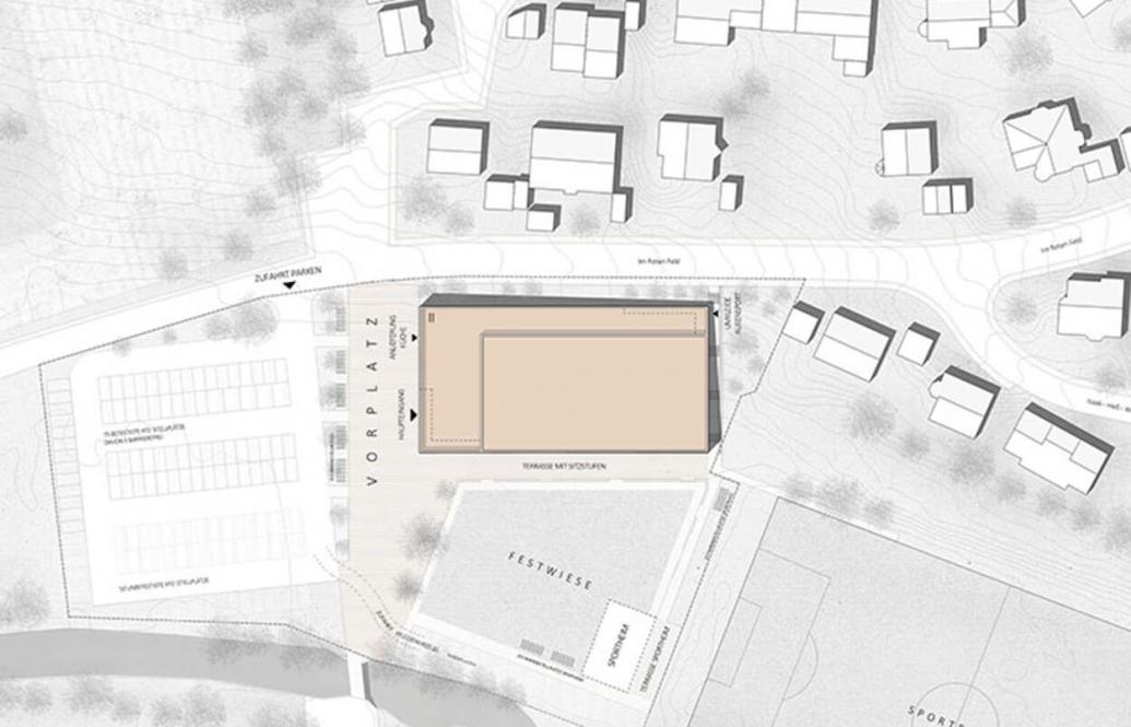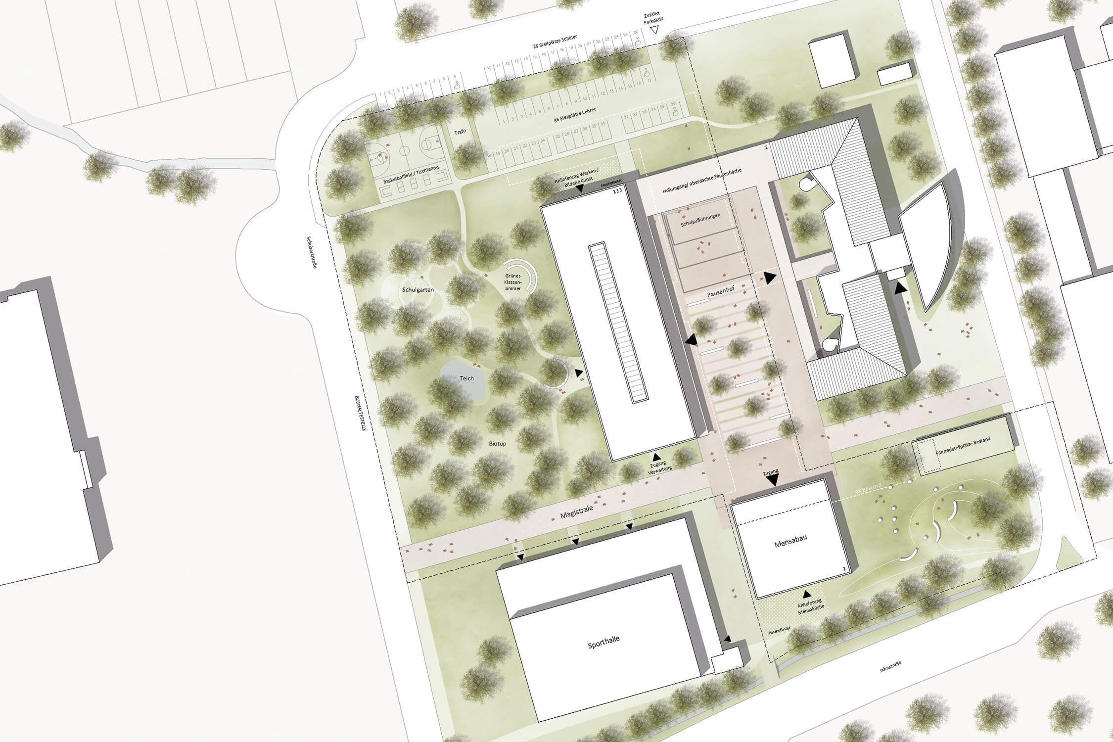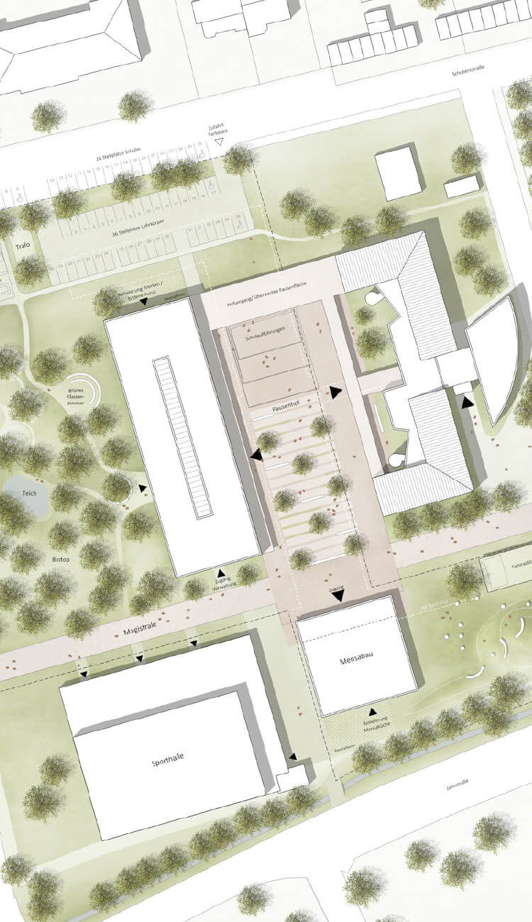 Der Neubau positioniert sich westlich gegenüber dem Bestand von 1998 und nimmt dessen Außenkanten, die Geschosshöhen und das Thema der Bandfassade auf. Dadurch erhält der nach dem Abbruch als 'unvollendete Form' wahrgenommene Baukörper einen Abschluss und bildet mit dem Neubau ein schlüssiges, von den Straßen abgerücktes Ensemble. Es entsteht ein geschützter Pausenhof. Der eingeschossige Mensabau schließt den Schulhof im Süden ab. Die neue Magistrale verläuft von Westen nach Osten und verbindet Bushaltestelle, Sporthalle, Gymnasium, Mensabau und die Realschule miteinander.