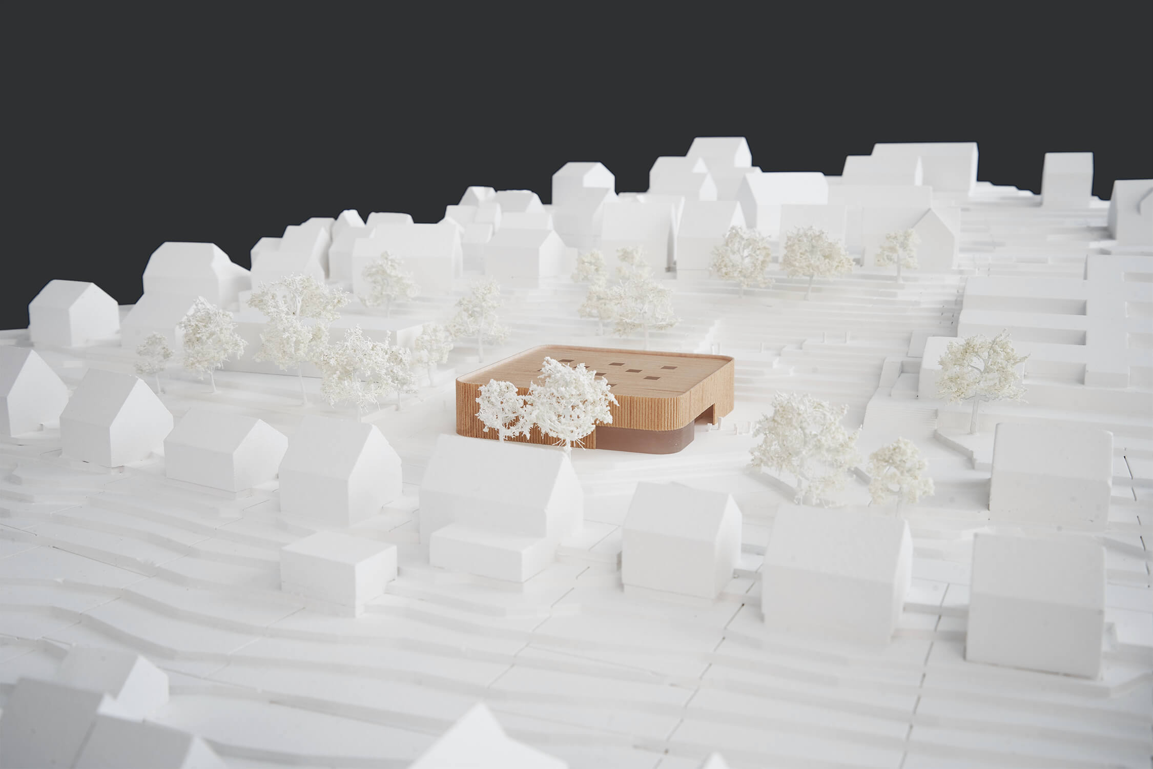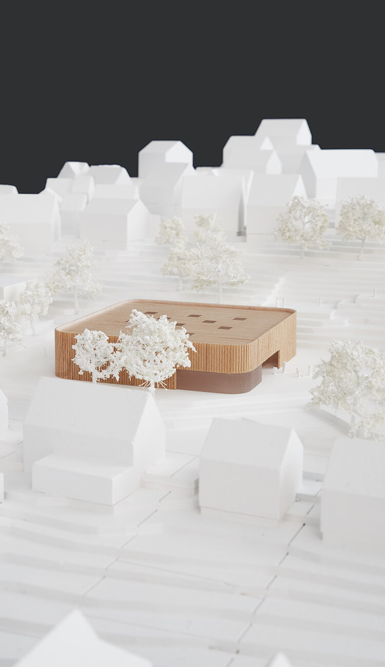 Der quadratische, solitäre Baukörper positioniert sich am Ende der Beethovenstraße und nimmt dabei die Flucht der Anna Haag Schule auf. Somit bilden die Anna Haag Schule und das neue Kinderhaus ein identitätsstiftendes Ensemble für den Stadtteil. Der Neubau wird bewusst von der Anna Haag Schule in Richtung Westen abgerückt, um einen Vorplatz zwischen Schule und Kinderhaus auszubilden. Den zwischen den Häusern liegenden Außenanlagen der Kita wird somit eine optimale Belichtung und ein unverbauter Blick nach Süden ermöglicht. Durch die gewählte Lage des Neubaus können Teile der Bestandsbäume entlang der Silcherstraße erhalten werden.