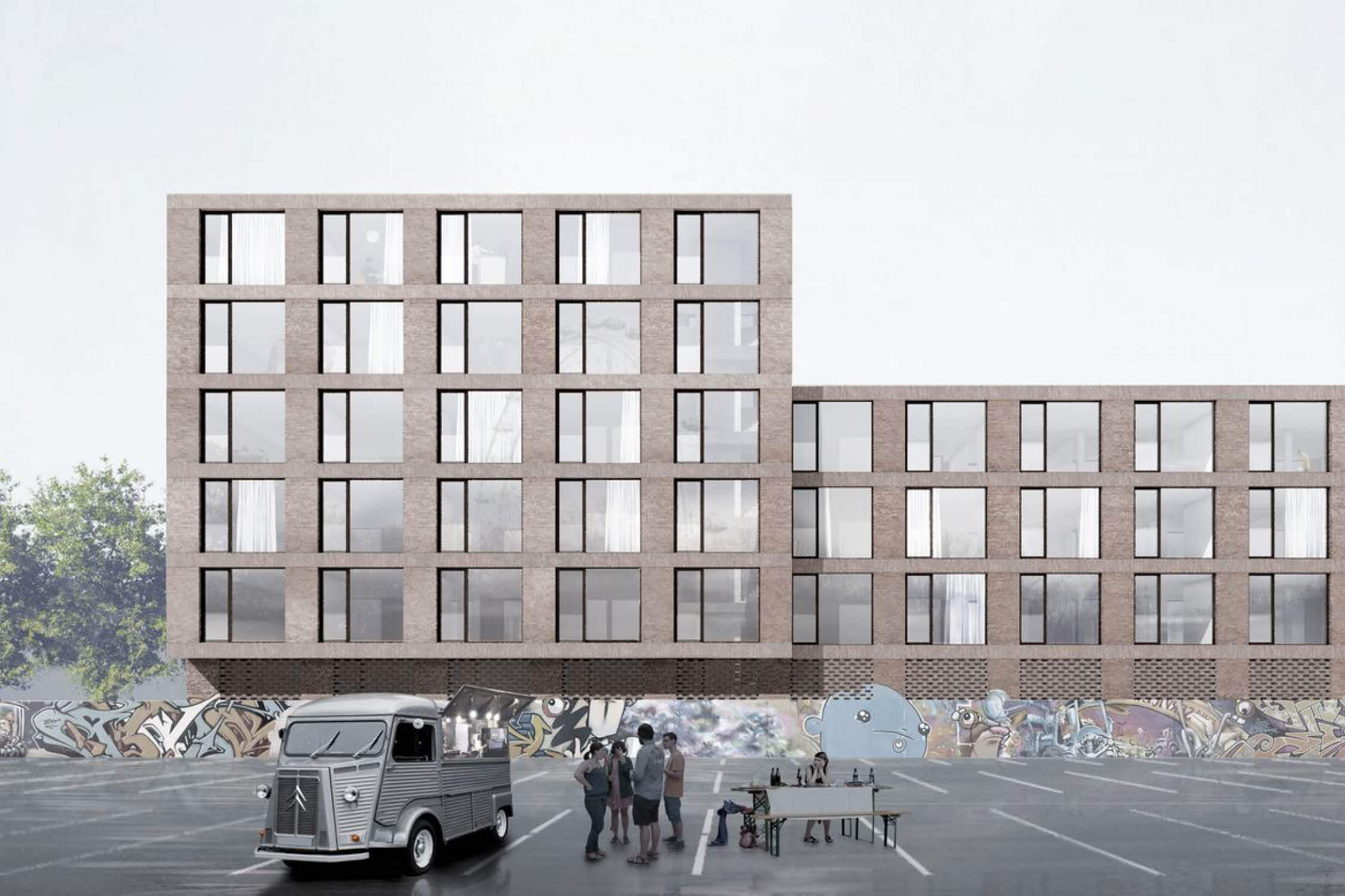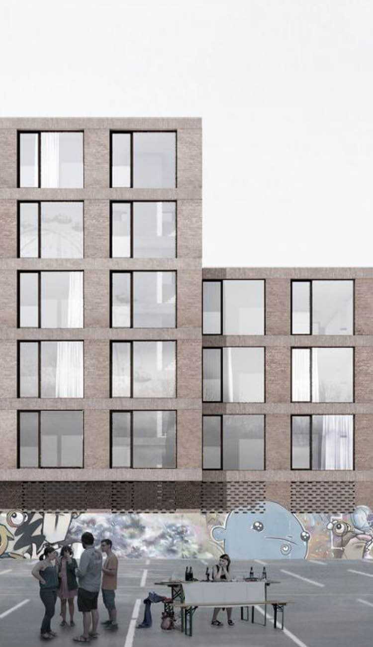 „Der klar und einfach gegliederte Baukörper fügt sich städtebaulich angenehm in die Umgebung und das Ensemble des alten Schlachthofs ein und hält die Vorgaben aus dem Bebauungsplan ein. Die zu erhaltene Graffitiwand zum Messplatz wird selbstverständlich in das Gebäude integriert... Der Eingang ist richtig angeordnet und wirkt durch einen Rücksprung in der Fassade einladend und ist leicht erkennbar... Direkt an das Foyer grenzt das zentrale Treppenhaus, welches ab dem Erdgeschoss sehr schön von Süden über einen Luftraum belichtet wird und einen Bezug zum Messplatz nach Süden ermöglicht. Das Gebäude strahlt eine ruhige, schlichte Wirkung durch seine streng rhythmisierenden Klinkerfassaden aus. Die innere Organisation überzeugt durch seine einfache klare Strukturierung… Die an den Stirnseiten schlanken Rankgitter für die Fassadenbegrünung kommen aus dem Erdreich und verbinden sich überlegt mit den Aurazonen im Norden und Süden. Insgesamt zeichnet sich der Beitrag durch seine Ruhe und Selbstverständlichkeit aus...“
