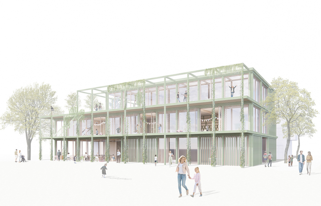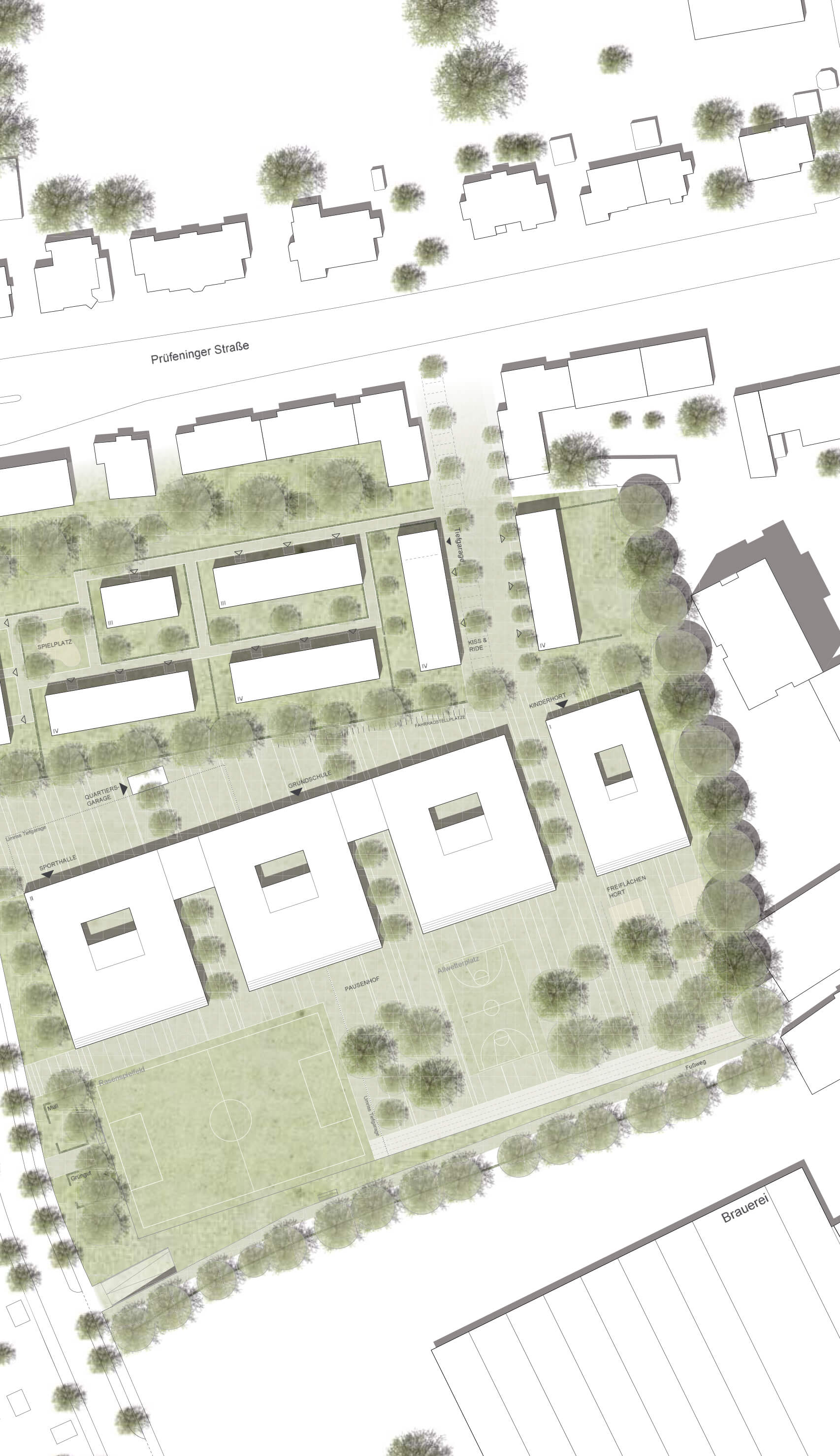 Die Neubauten der Grundschule und des Horts gliedern sich in vier ablesbare Bausteine. Diese orientieren sich zusammen mit den Freianlagen zur südlichen Grundstücksgrenze. Die breite Abstandszone zum Brauereigelände wird als „Grünpuffer“ genutzt, in dem die Freianlagen und der Pausenhof liegen. Der neu zu planende Geschosswohnungsbau orientiert sich an der vorhandenen Bebauung und ergänzt diese zu einem Blockrand. Besonderes Augenmerk bei der Schule wurde auf eine klare Struktur und gute Orientierung für die Kinder gelegt. Diese Kriterien werden auch in der inneren Struktur verfolgt.
