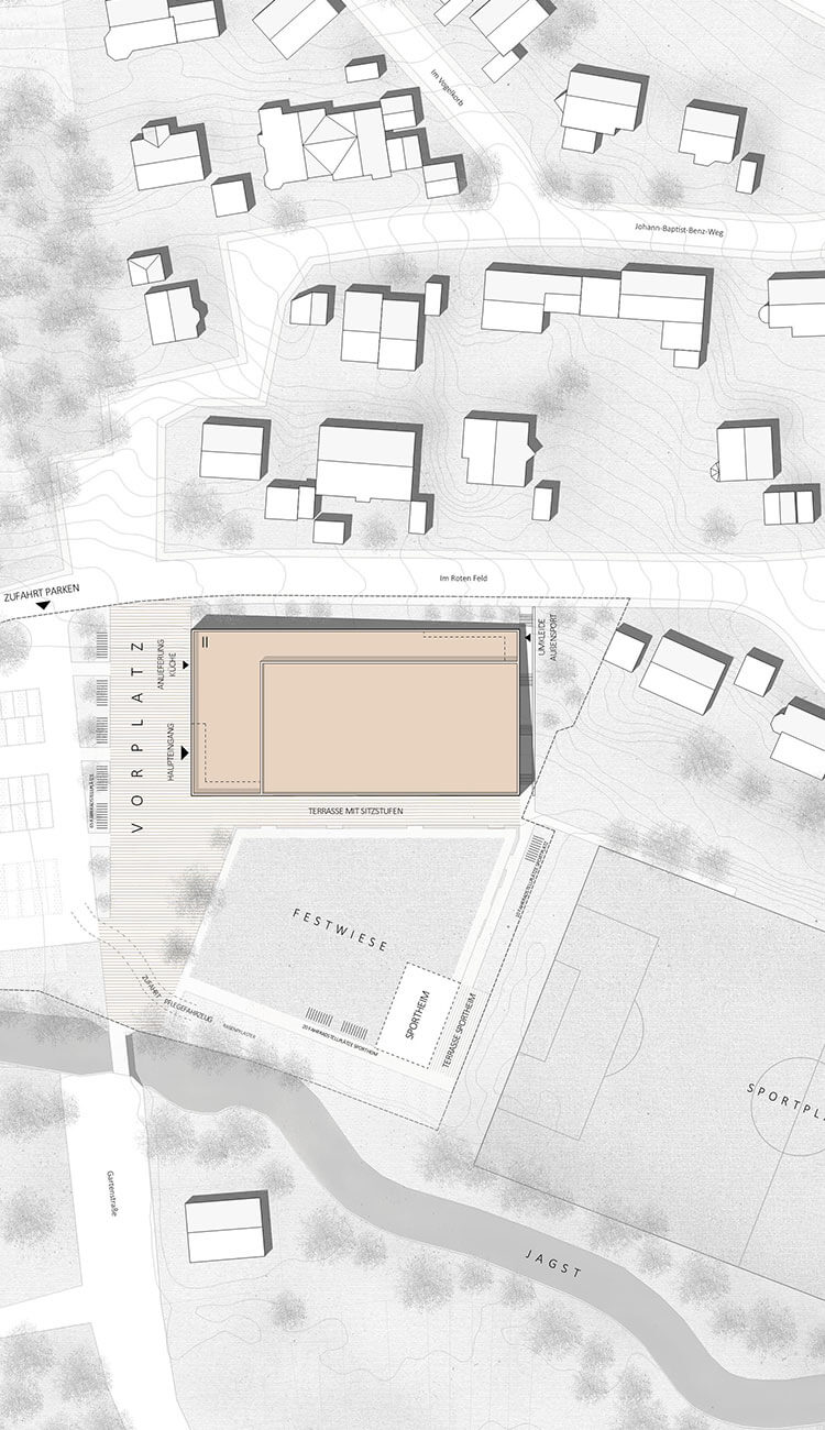 Die Mehrzweckhalle bildet im Zusammenspiel mit der umgebenden Wohnbebauung den Auftakt am Siedlungsrand. Der Neubau kompensiert den starken Höhenunterschied zwischen der Straße und der Jagstaue und schafft durch die straßennahe Lage Raum für eine großzügige Fest- und Spielwiese entlang des Flussufers. Das Sportheim positioniert sich zwischen der Wiese und dem Fußballfeld circa 17 Meter von der Oberkante der Uferböschung entfernt und erhält eine eigene Terrasse, von der aus sich die Fußballspiele beobachten lassen.