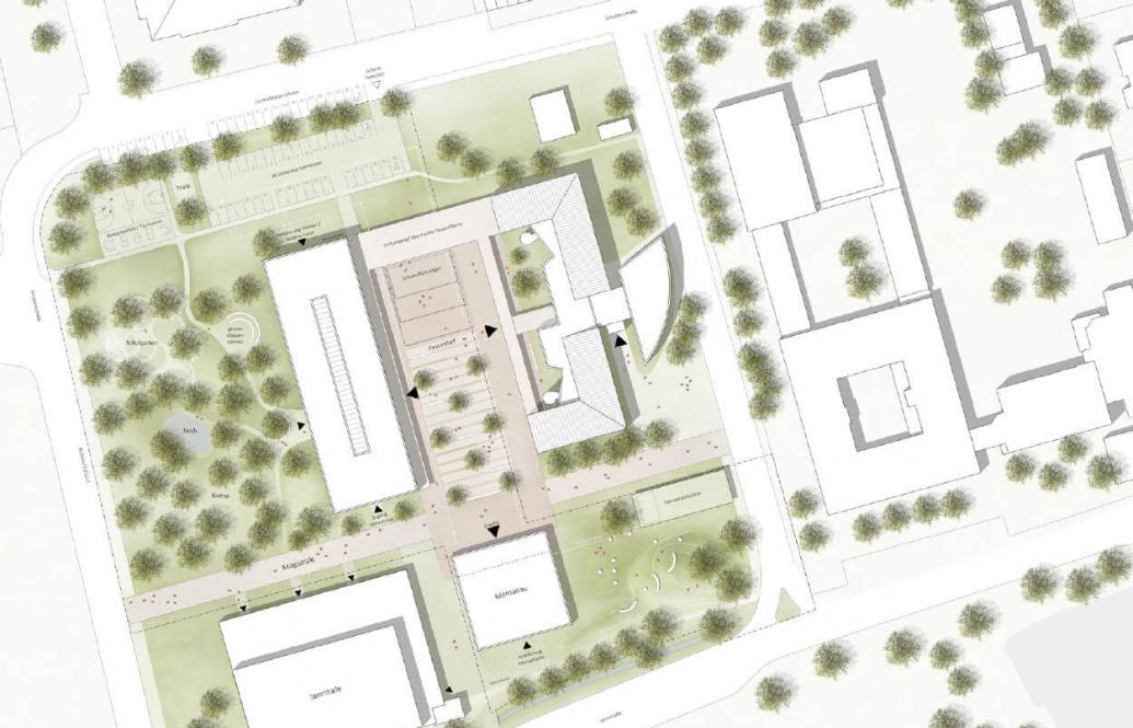 Ziel des Entwurfs ist ein moderner und ortsprägender Baustein. Der Neubau nutzt das vorgegebene Grundstück maximal aus und reagiert mit seinen Gebäudekanten auf die umgebende Bebauung sowie die vorhandenen Wegeführungen. Daraus resultiert ein dreigeschossiger Baustein, der sich harmonisch in die umgebende Bebauung einfügt und gleichzeitig als eigenständiges und zukunftsweisendes Gebäude wahrgenommen wird.