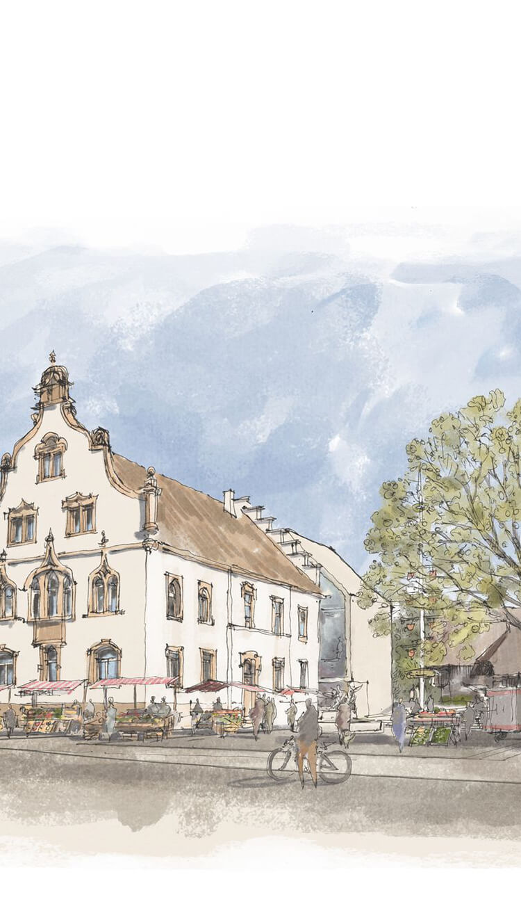 Mit der Verglasung zum Rathaus hin, wird die historische Fassade erlebbar gemacht. Nach Süden hat man durch die großzügige Verglasung schöne Ausblicke zum „historischen Speicher“ und in die Landschaft des Schwarzwaldes. Der Anbau schiebt sich ein Stück in die Platzfläche, was die Auffindbarkeit des Zugangs erleichtert. Das ehemalige Feuerwehrhaus bleibt in seinem Erscheinungsbild als solches weiterhin erkennbar.