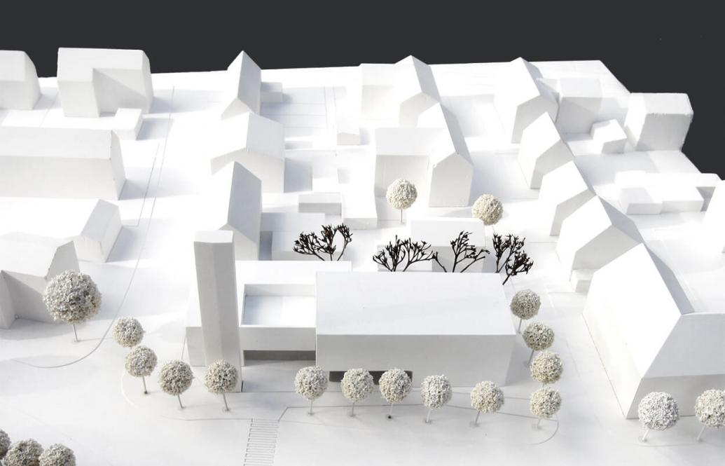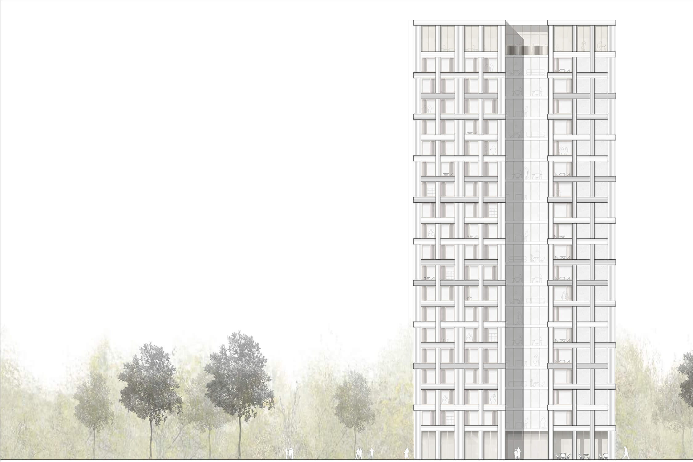Mit diesem Leitgedanken wird das neue Studentenwohnheim als Hochhaus-Solitär mit 20 Vollgeschossen auf dem Grundstück platziert. Dadurch entsteht ein großzügiger Freiraum rund um das Gebäude.