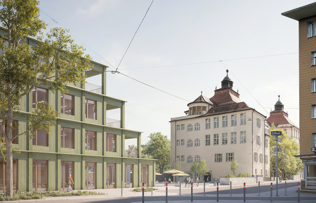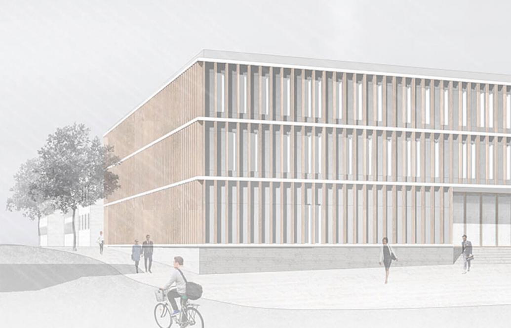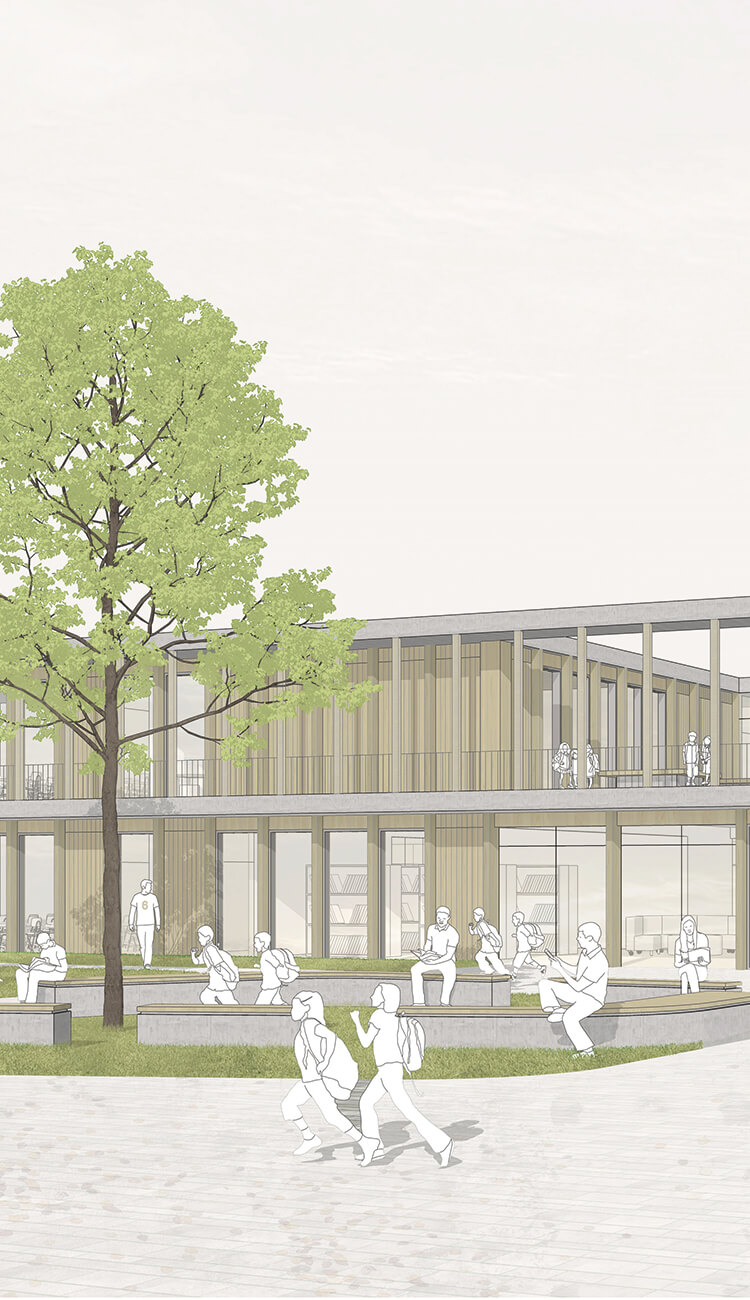 Ziel des Entwurfs ist es einen Schulcampus, mit hoher Aufenthaltsqualität zu schaffen. Der Schulneubau bildet zusammen mit den beiden Sportstätten im Norden und Süden des Grundstücks, sowie dem Ganztagesgebäude ein klar ablesbares Schulensemble. Durch die gewählte städtebauliche Anordnung des Neubaus wird der Campus in vertikale Nutzungsbereiche zoniert.