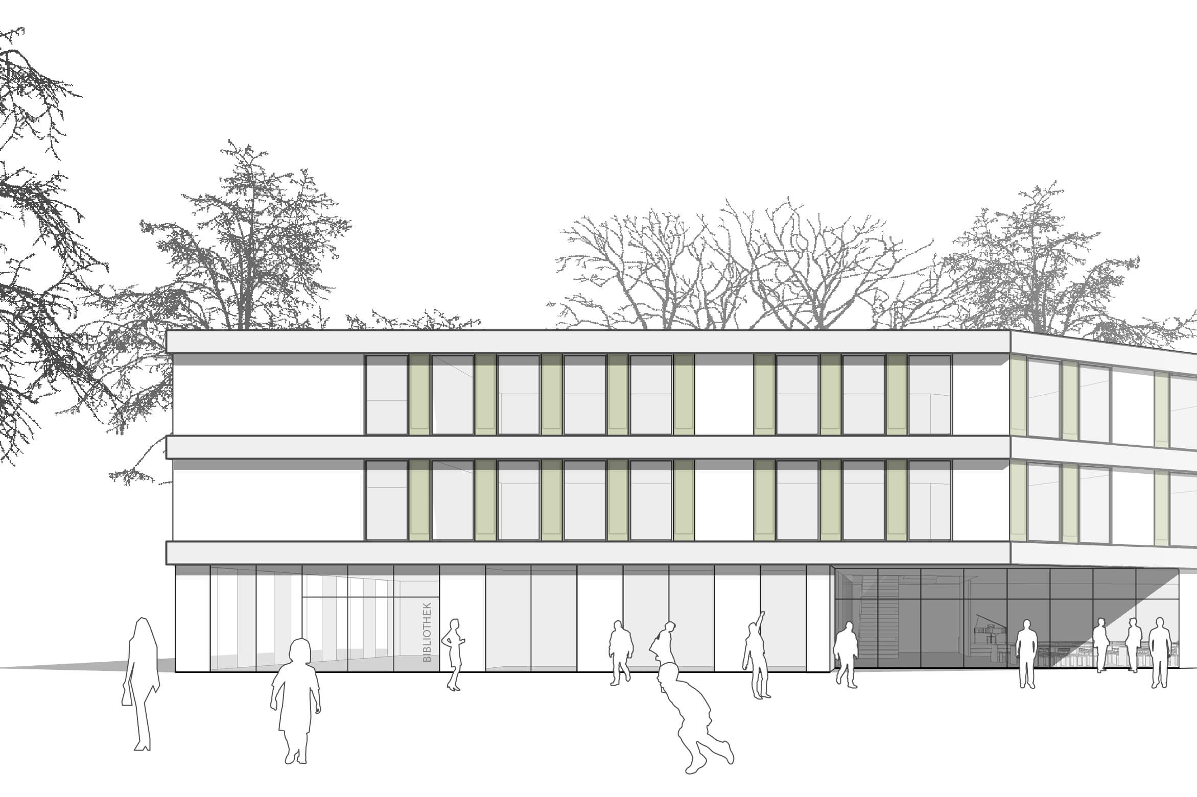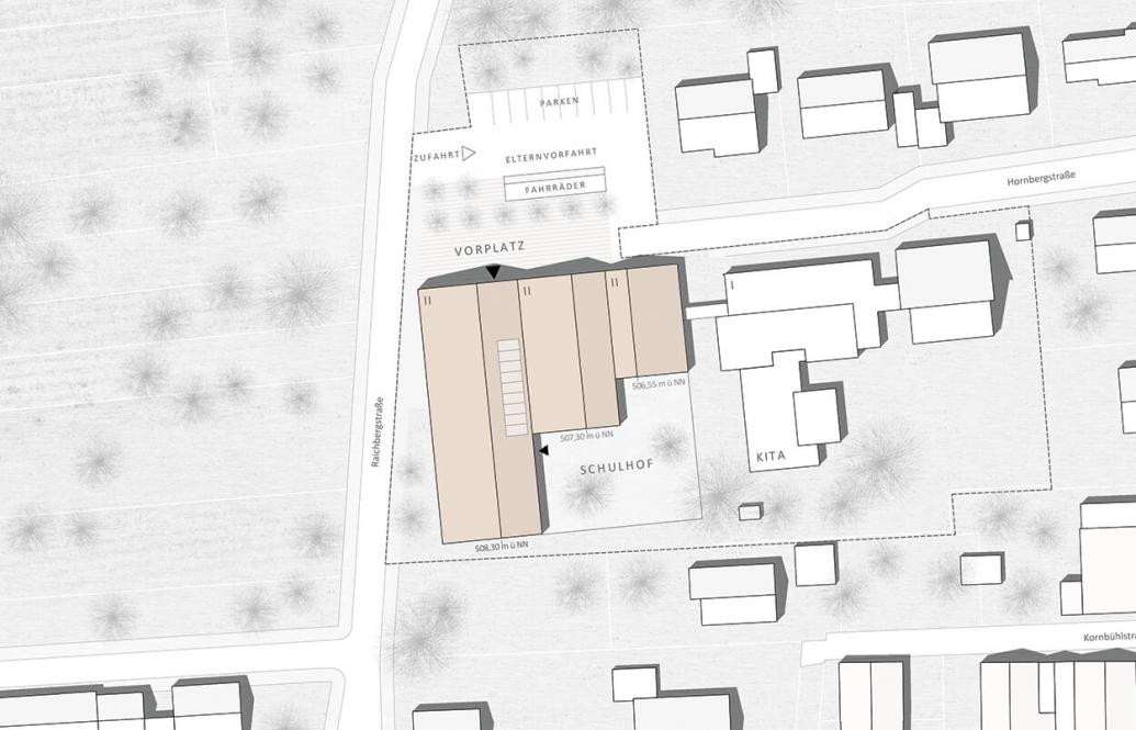 Der Neubau für die Gesamtschule positioniert sich anstelle des bisherigen zweigeschossigen Schulbaus. Seine Form erhält er durch den Zuschnitt des Grundstücks und durch umliegende Wege- und städtebauliche Bezüge. Zusammen mit dem ehemaligen Schulhaus bildet der Neubau ein attraktives Ensemble im Stadtbild Baienfurt. Durch die gewählte Positionierung des Neubaus entstehen großzügige und qualitätvolle Außenanlagen mit Orientierung zum Grünraum der Wolfegger Ach.