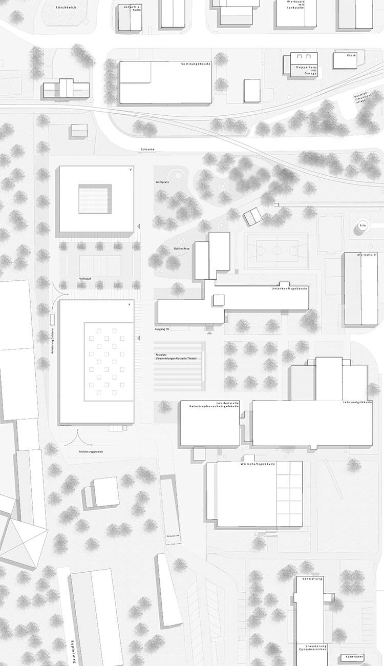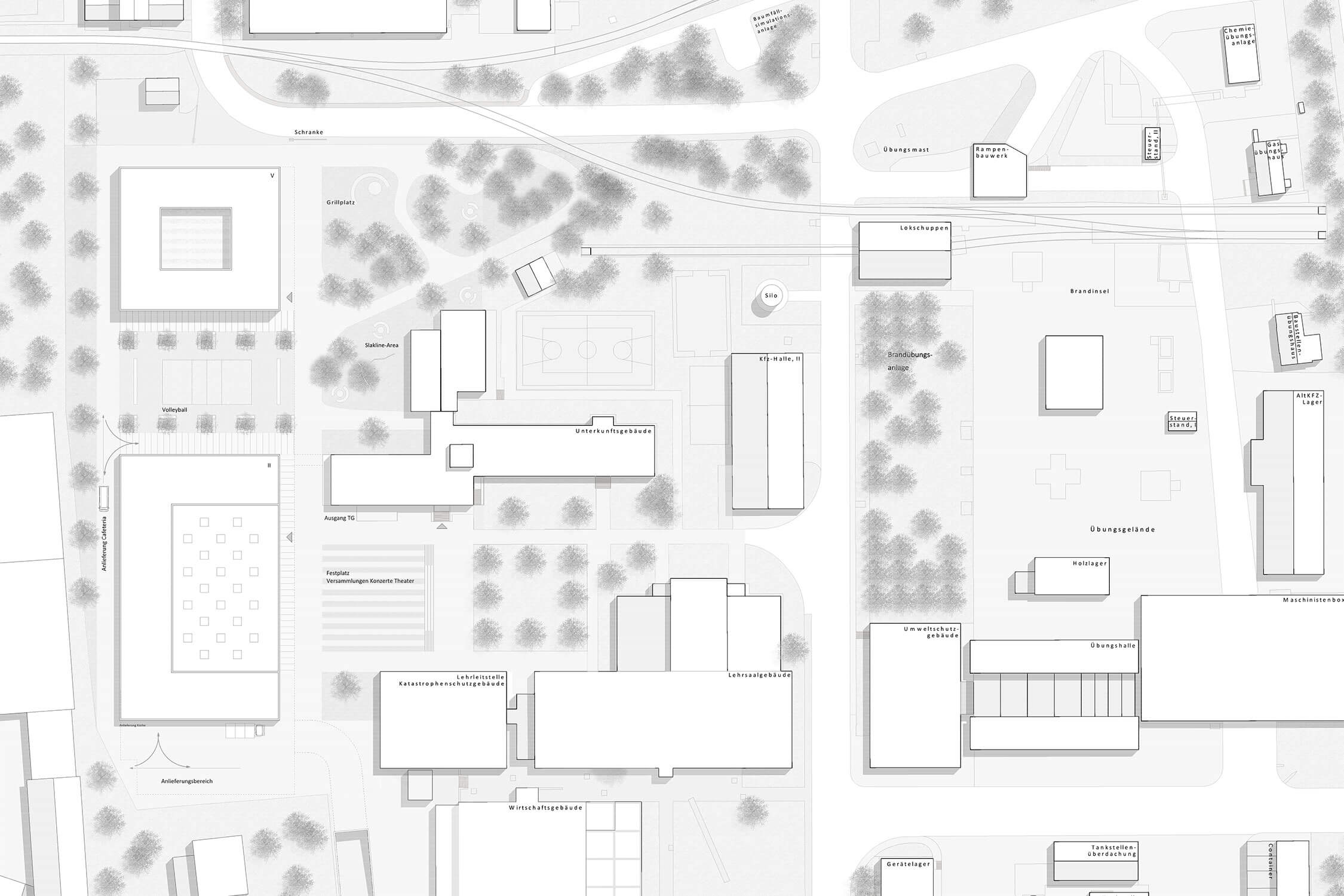 Das zweigeschossige Wirtschaftsgebäude mit Mensa und Cafeteria bildet zusammen mit dem bestehenden südlichen Unterrichtsgebäude und dem vorhandenen Wohngebäude einen markanten zentralen Bereich für die gesamte Feuerwehrschule. Das nördlich dazu platzierte, neue Unterkunftsgebäude nimmt exakt die seitlichen Fluchten des Mensabaus auf und bildet im Freiraum zur Mensa hin einen eher intern genutzten grünen Bereich.