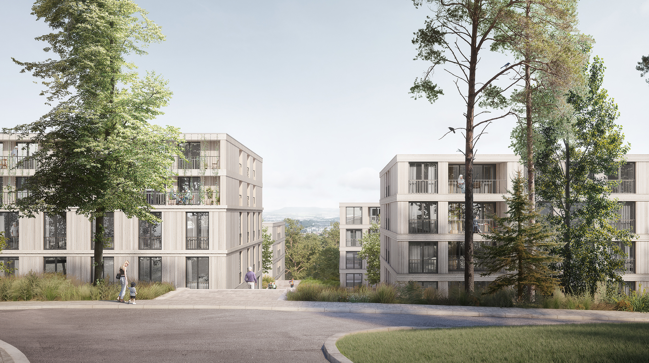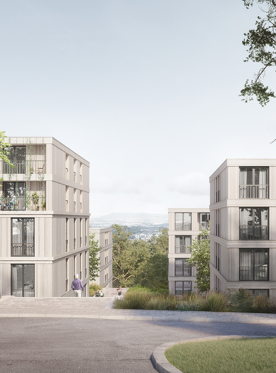 Der geplante Gebäudekomplex besteht aus vier Bausteinen, die sich entlang der Arthurstraße den Hang zum Rohrer Park in der Höhe und Ausrichtung abstaffeln und in den Hang einbetten. Die starke Topografie des Grundstücks wird als Chance genutzt, die Gebäude in der Höhe und Ausrichtung so zu entwickeln, dass neben einem freien Blick ins Grüne den einzelnen Häuser auch genügend Freiraum geschaffen werden kann.