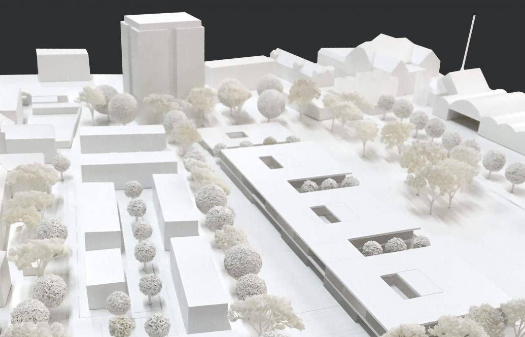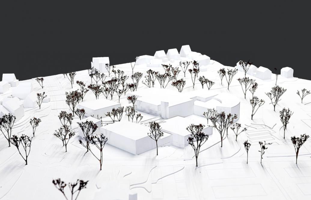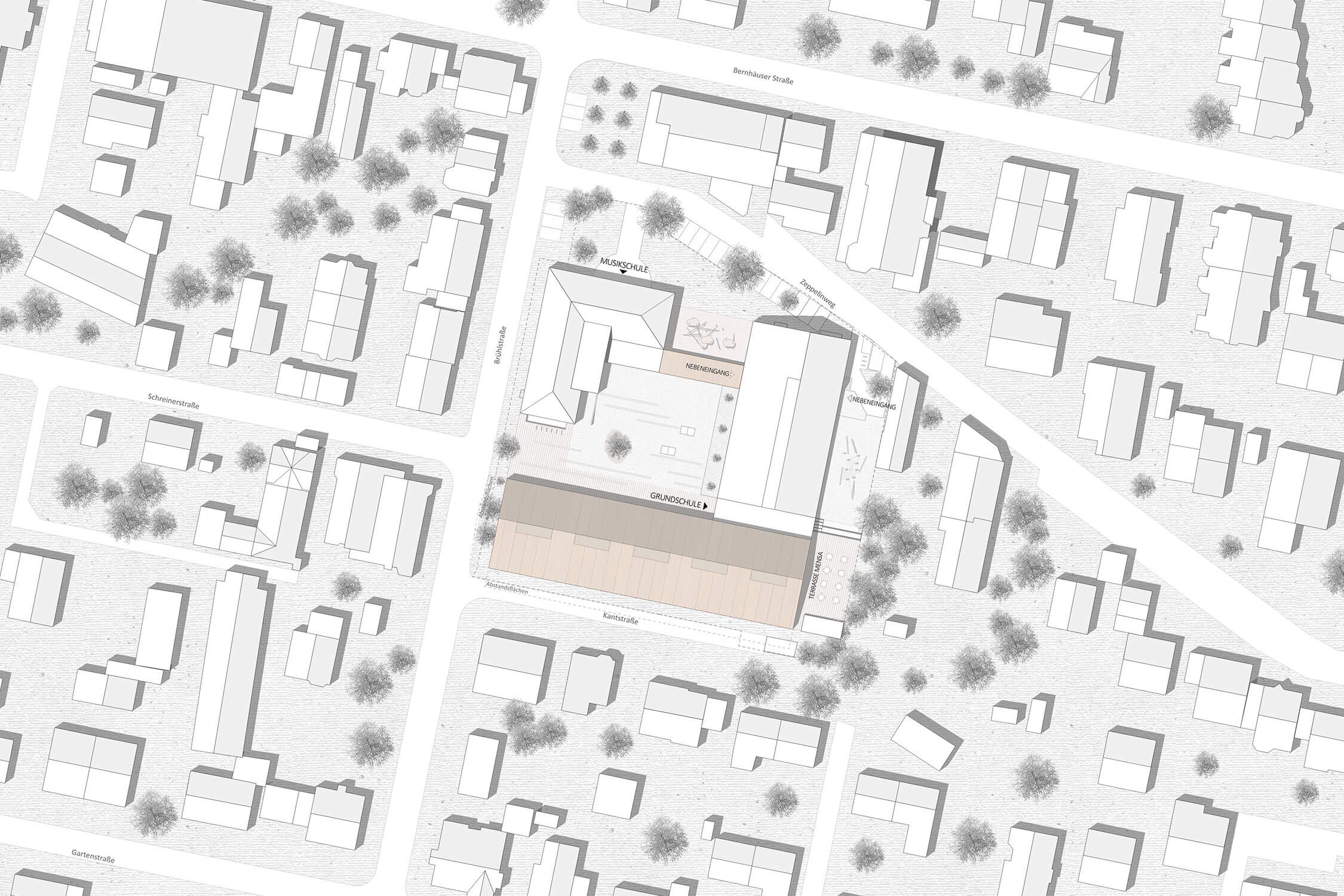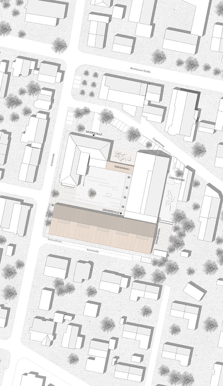 Ziel des Entwurfs ist es, einen städtebaulich klar ablesbaren Schulkomplex zu errichten. Die Erweiterung der Grundschule wird als langer horizontaler Baukörper entlang der Kantstraße positioniert und bildet damit im Zusammenspiel mit den beiden Bestandsgebäuden einen gefassten Schulcampus. An der Brühlstraße entsteht zwischen Neubau und Musikschule ein klar definierter Eingang zum Campus. Der zweigeschossige Neubau mit seinem Satteldach und seiner Holzfassade integriert sich sensibel in den vorhandenen Kontext.